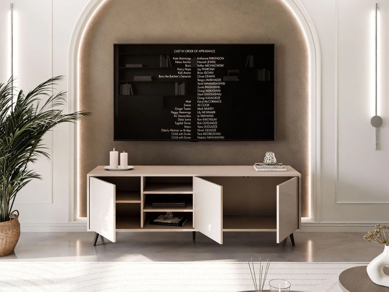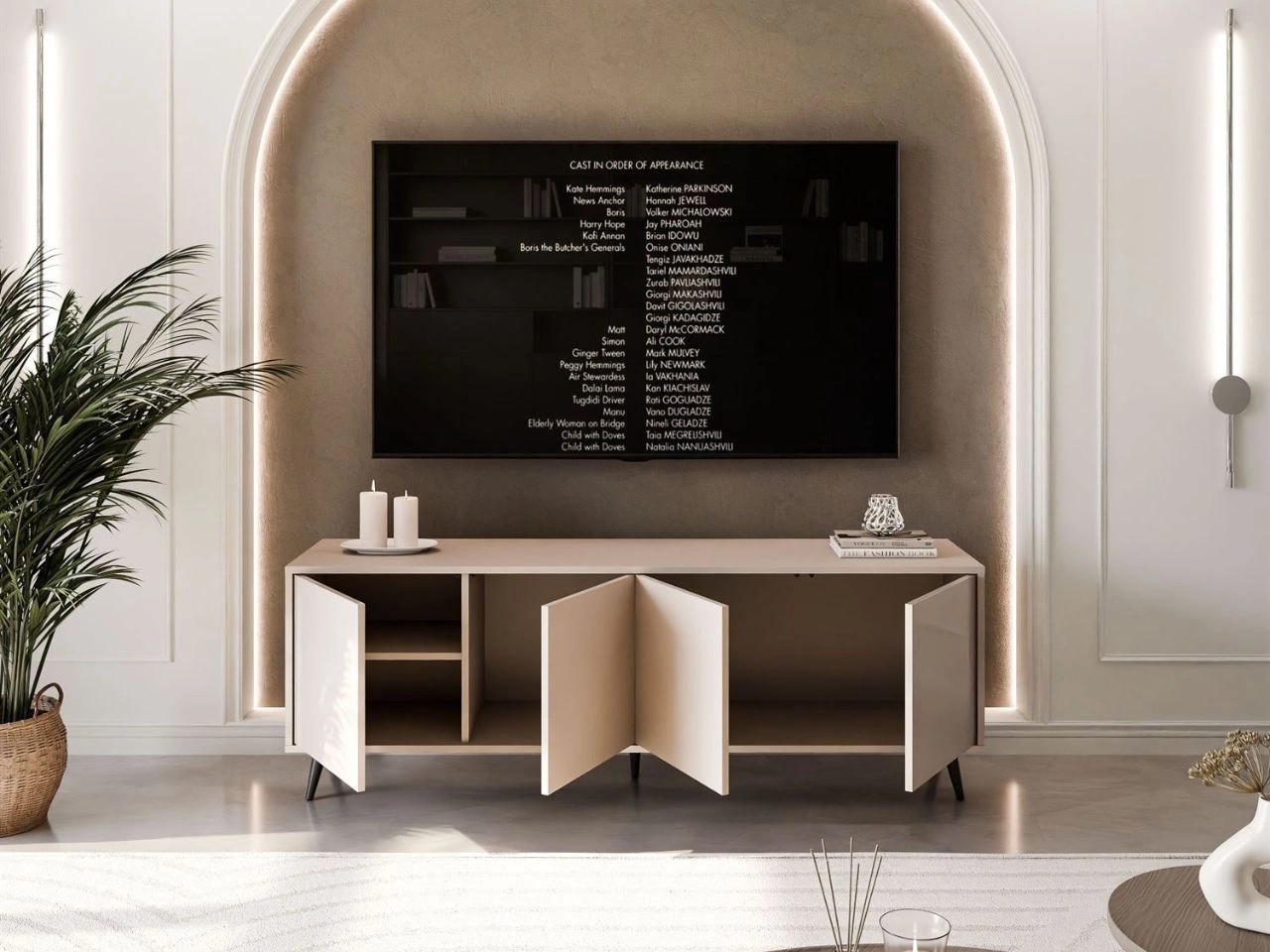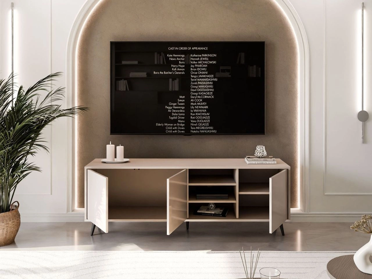 Kaszmirowa czterodrzwiowa szafka RTV Vivance została stworzona w taki sposób, aby można było dopasować ją do własnych preferencji. Co to oznacza? Wraz z meblem otrzymujemy w zestawie cztery fronty drzwiowe, ale nie trzeba ich wszystkich montować. Konstrukcja meble pozwala na pozostawienie otwartej wnęki z półkami w środkowej części - po lewej lub prawej stronie. Można mieś zatem szafkę cztero- lub trzydrzwiową. Mebel posiada dwie mniejsze wnęki i jedną większą. Znajdziemy tu też trzy półki. Drzwiczki wyposażono w bezuchwytowy system otwierania Push To Open - naciśnij, aby otworzyć.