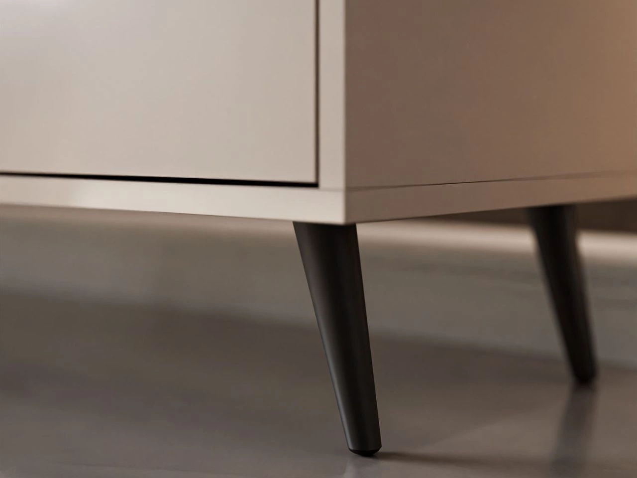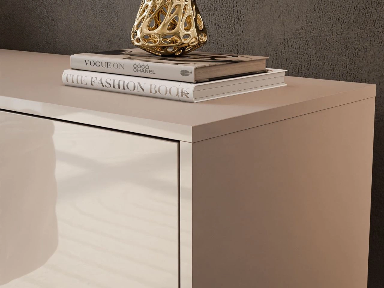 Szafka telewizyjna Vivance wykonana została z wysokiej klasy płyty laminowanej, której obrzeża zabezpieczono okleiną ABS chroniącą przed powstawaniem drobnych zarysowań i uszkodzeń mechanicznych. W tylnej ściance wycięto okrągły otwór, pozwalający na estetyczne wyprowadzenie przewodów i kabli na zewnątrz. Fronty wykończone są w wysokim połysku, korpus natomiast w macie. Całość postawiona jest na estetycznych nóżkach z metalu.