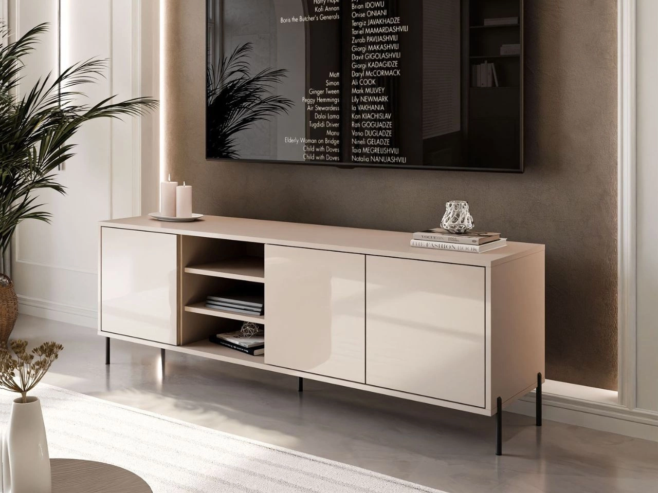 Kaszmirowa czterodrzwiowa szafka RTV Vivance została stworzona w taki sposób, aby można było dopasować ją do własnych preferencji. Co to oznacza? Wraz z meblem otrzymujemy w zestawie cztery fronty drzwiowe, ale nie trzeba ich wszystkich montować. Konstrukcja meble pozwala na pozostawienie otwartej wnęki z półkami w środkowej części - po lewej lub prawej stronie. Można mieś zatem szafkę cztero- lub trzydrzwiową. Mebel posiada dwie mniejsze wnęki i jedną większą. Znajdziemy tu też trzy półki. Drzwiczki wyposażono w bezuchwytowy system otwierania Push To Open - naciśnij, aby otworzyć.