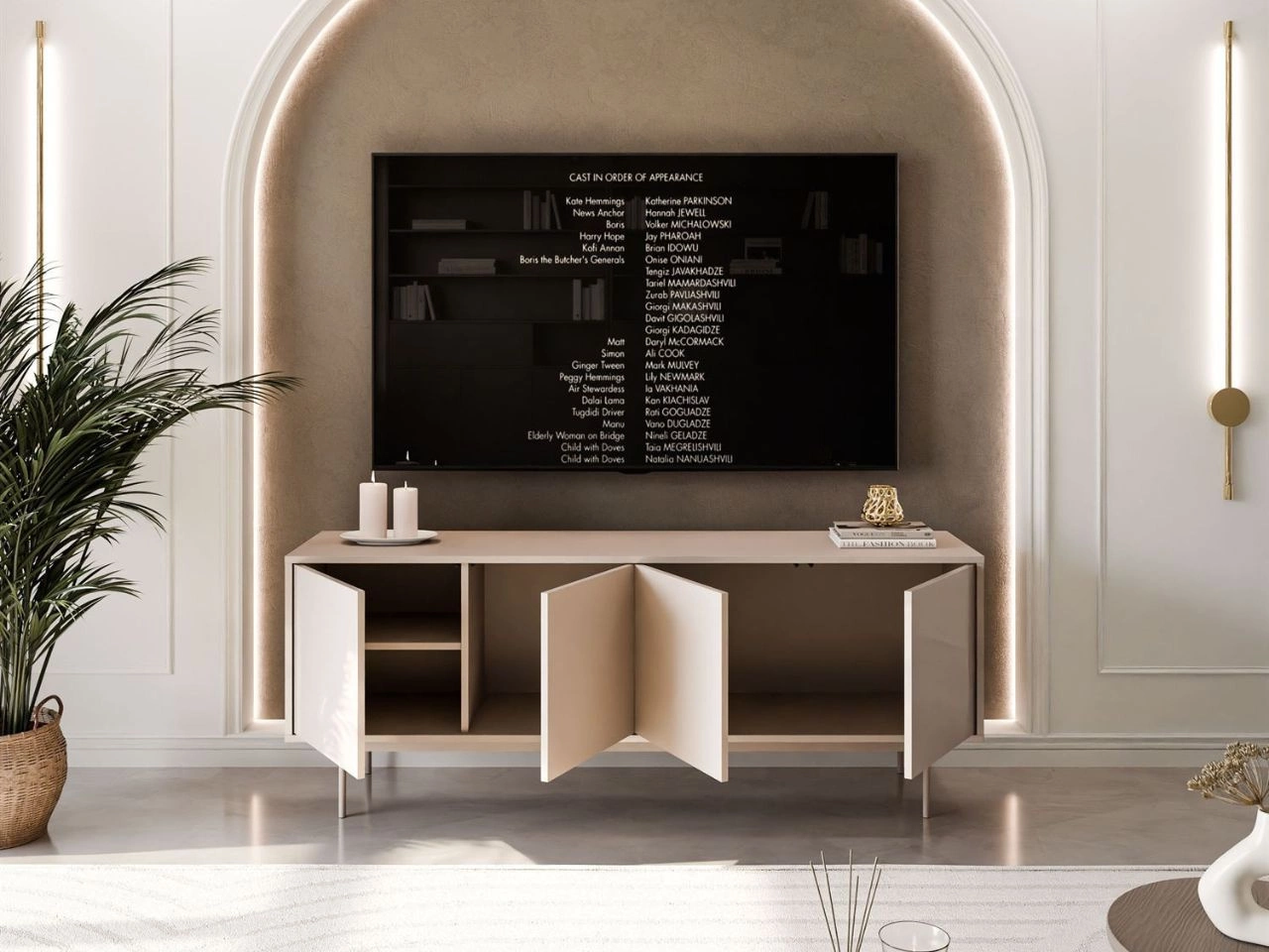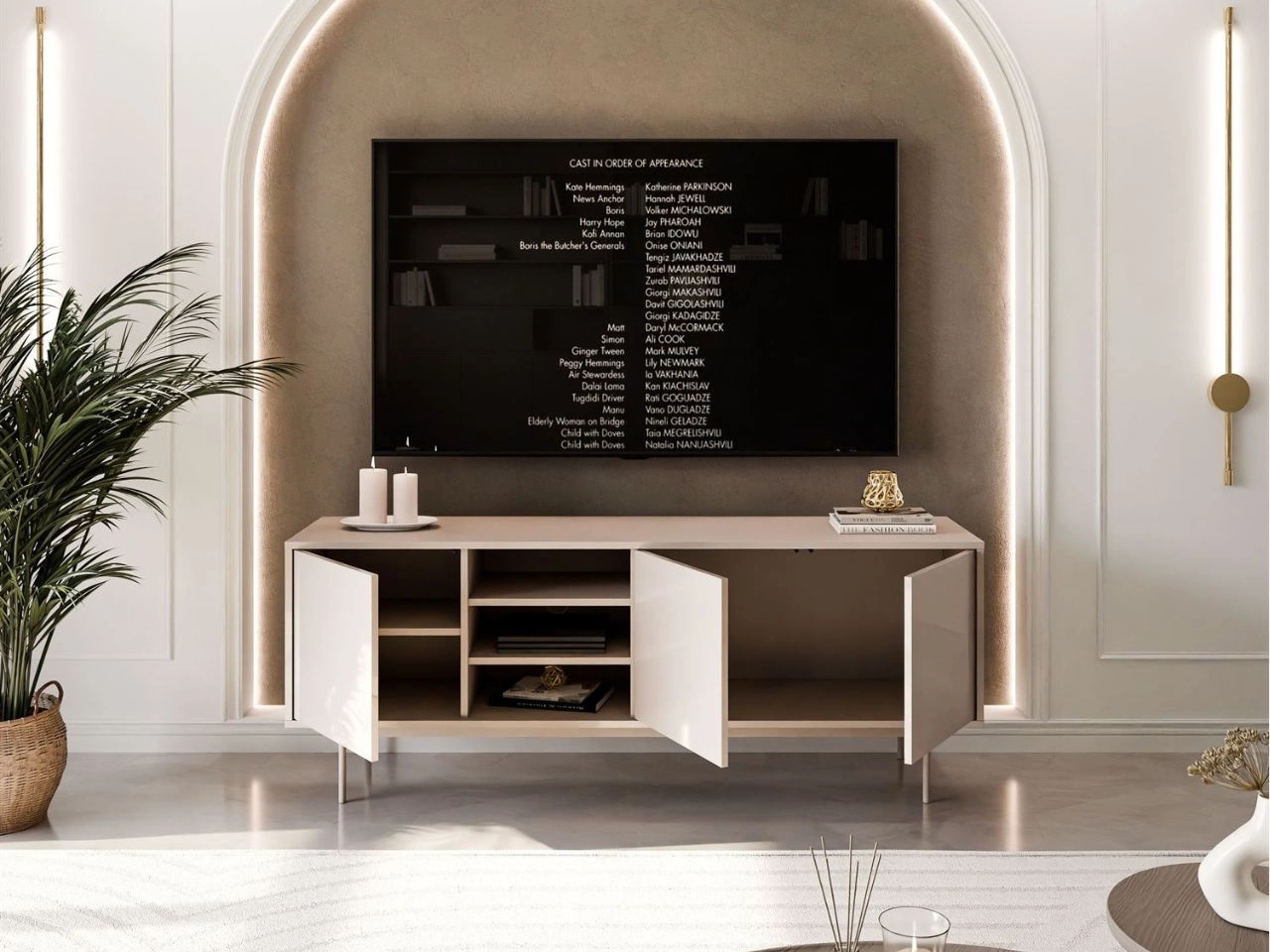 Kaszmirowa czterodrzwiowa szafka RTV Vivance została stworzona w taki sposób, aby można było dopasować ją do własnych preferencji. Co to oznacza? Wraz z meblem otrzymujemy w zestawie cztery fronty drzwiowe, ale nie trzeba ich wszystkich montować. Konstrukcja meble pozwala na pozostawienie otwartej wnęki z półkami w środkowej części - po lewej lub prawej stronie. Można mieś zatem szafkę cztero- lub trzydrzwiową. Mebel posiada dwie mniejsze wnęki i jedną większą. Znajdziemy tu też trzy półki. Drzwiczki wyposażono w bezuchwytowy system otwierania Push To Open - naciśnij, aby otworzyć.