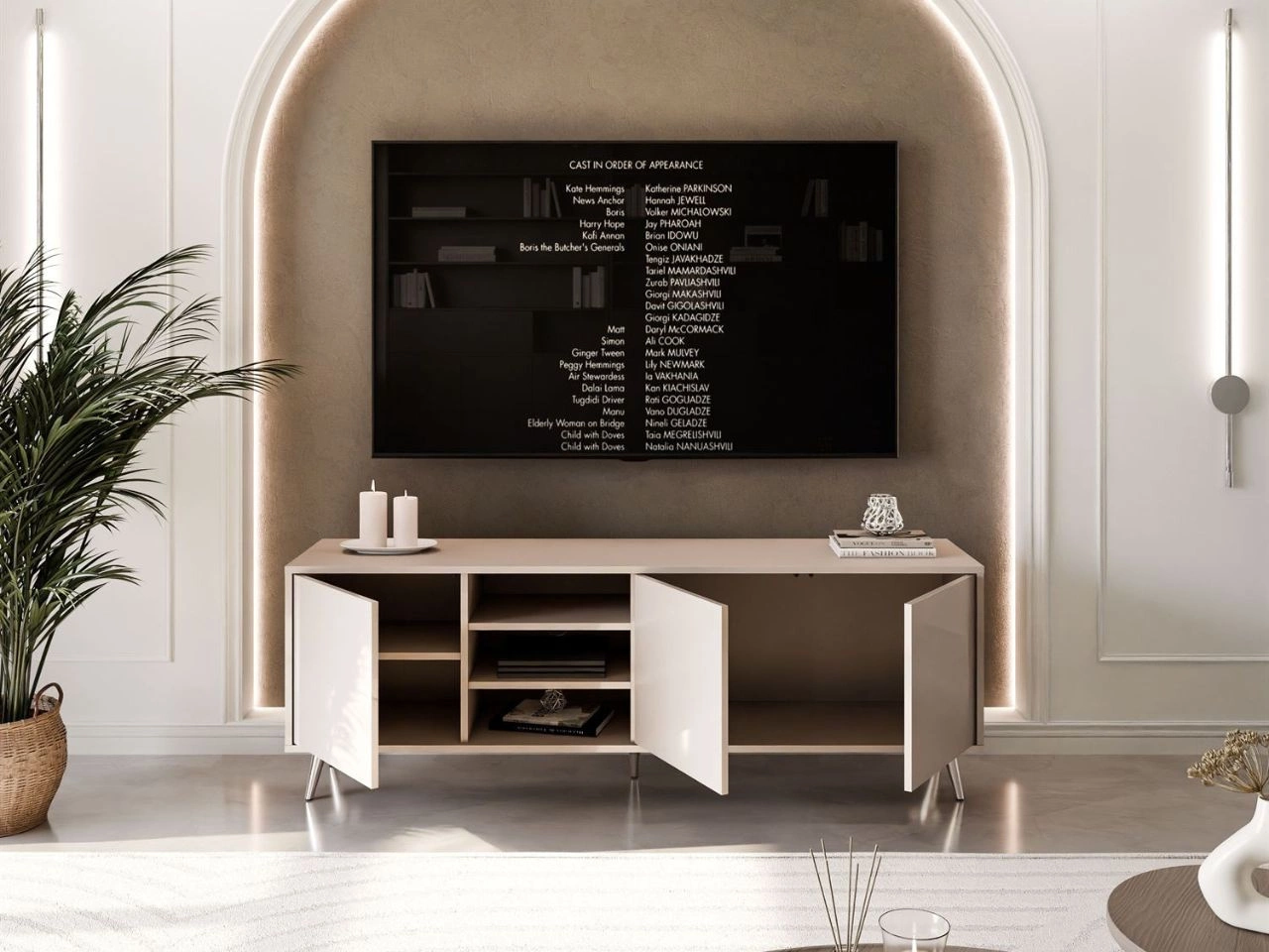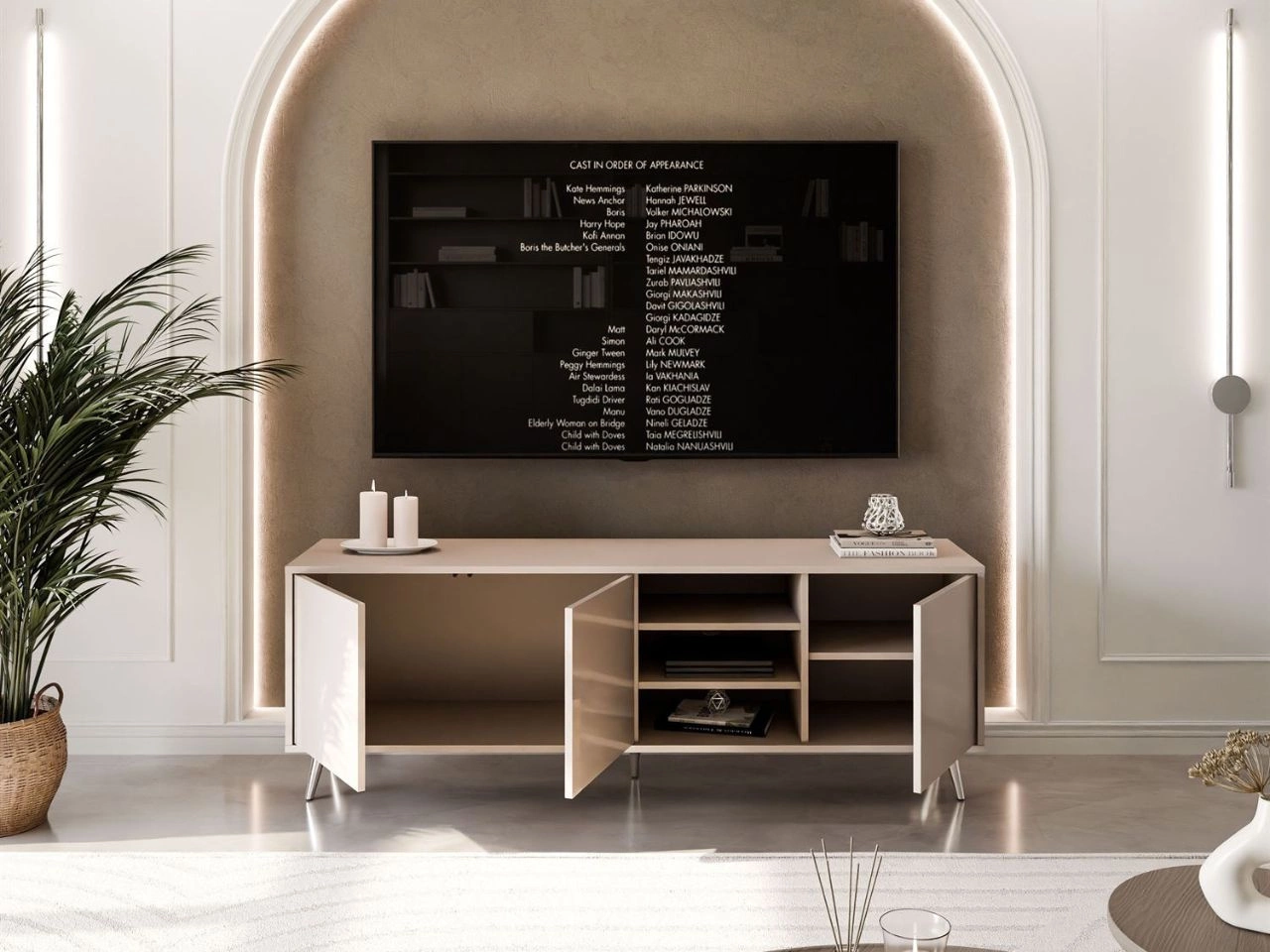 Kaszmirowa czterodrzwiowa szafka RTV Vivance została stworzona w taki sposób, aby można było dopasować ją do własnych preferencji. Co to oznacza? Wraz z meblem otrzymujemy w zestawie cztery fronty drzwiowe, ale nie trzeba ich wszystkich montować. Konstrukcja meble pozwala na pozostawienie otwartej wnęki z półkami w środkowej części - po lewej lub prawej stronie. Można mieś zatem szafkę cztero- lub trzydrzwiową. Mebel posiada dwie mniejsze wnęki i jedną większą. Znajdziemy tu też trzy półki. Drzwiczki wyposażono w bezuchwytowy system otwierania Push To Open - naciśnij, aby otworzyć.