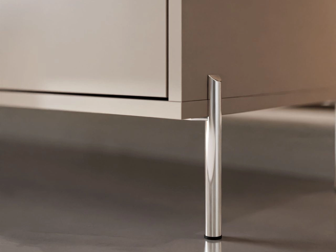 Szafka telewizyjna Vivance wykonana została z wysokiej klasy płyty laminowanej, której obrzeża zabezpieczono okleiną ABS chroniącą przed powstawaniem drobnych zarysowań i uszkodzeń mechanicznych. W tylnej ściance wycięto okrągły otwór, pozwalający na estetyczne wyprowadzenie przewodów i kabli na zewnątrz. Fronty wykończone są w wysokim połysku, korpus natomiast w macie. Całość postawiona jest na estetycznych nóżkach z metalu.