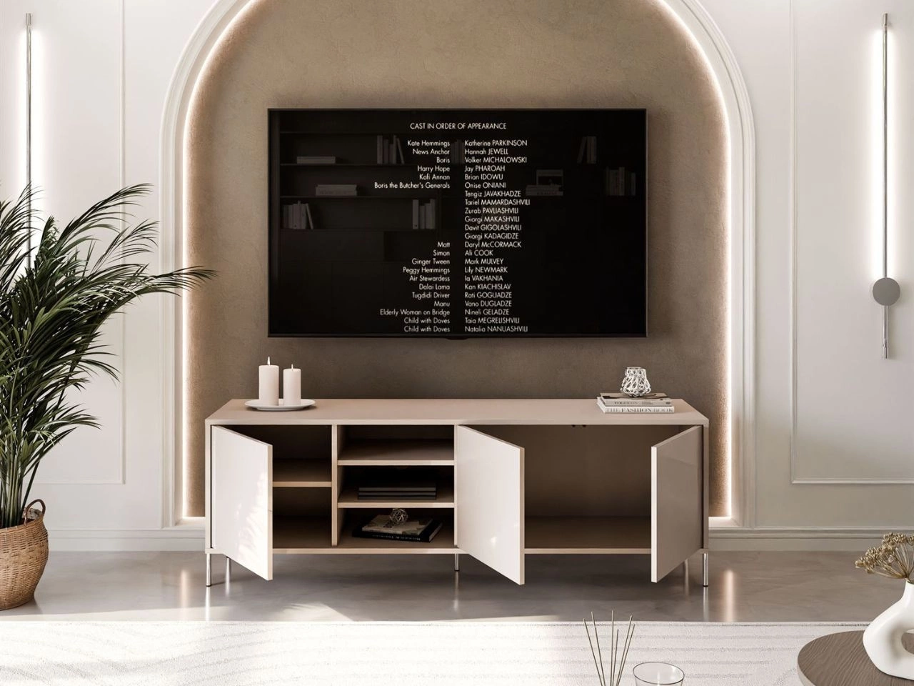 Kaszmirowa czterodrzwiowa szafka RTV Vivance została stworzona w taki sposób, aby można było dopasować ją do własnych preferencji. Co to oznacza? Wraz z meblem otrzymujemy w zestawie cztery fronty drzwiowe, ale nie trzeba ich wszystkich montować. Konstrukcja meble pozwala na pozostawienie otwartej wnęki z półkami w środkowej części - po lewej lub prawej stronie. Można mieś zatem szafkę cztero- lub trzydrzwiową. Mebel posiada dwie mniejsze wnęki i jedną większą. Znajdziemy tu też trzy półki. Drzwiczki wyposażono w bezuchwytowy system otwierania Push To Open - naciśnij, aby otworzyć.