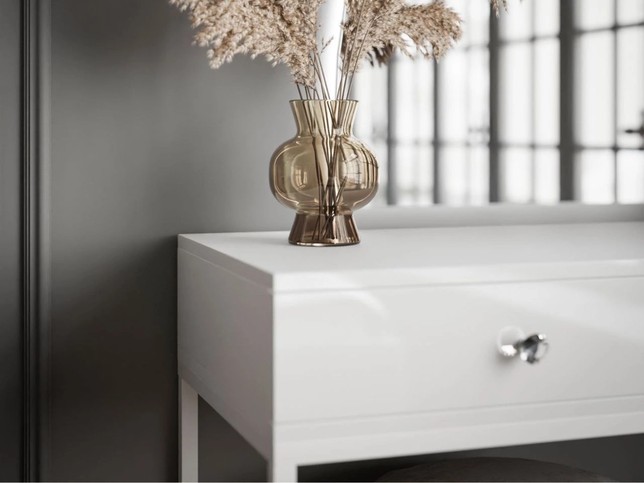 Wyposażona w dwie pojemne szuflady z kryształowymi uchwytami, osadzone na prowadnicach kulkowych z pełnym wysuwem, toaletka Clarette pozwala wygodnie przechowywać kosmetyki, akcesoria i drobiazgi, ułatwiając utrzymanie porządku. Stabilna podstawa w eleganckim wykończeniu podkreśla lekkość konstrukcji, a jednocześnie wprowadza do przestrzeni nutę luksusu i harmonii. To idealny wybór dla osób, które chcą połączyć estetykę z praktycznością.