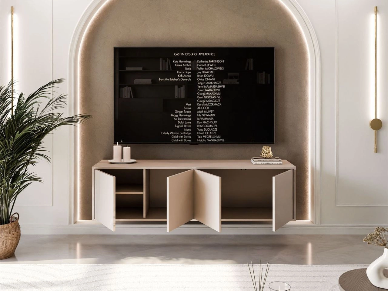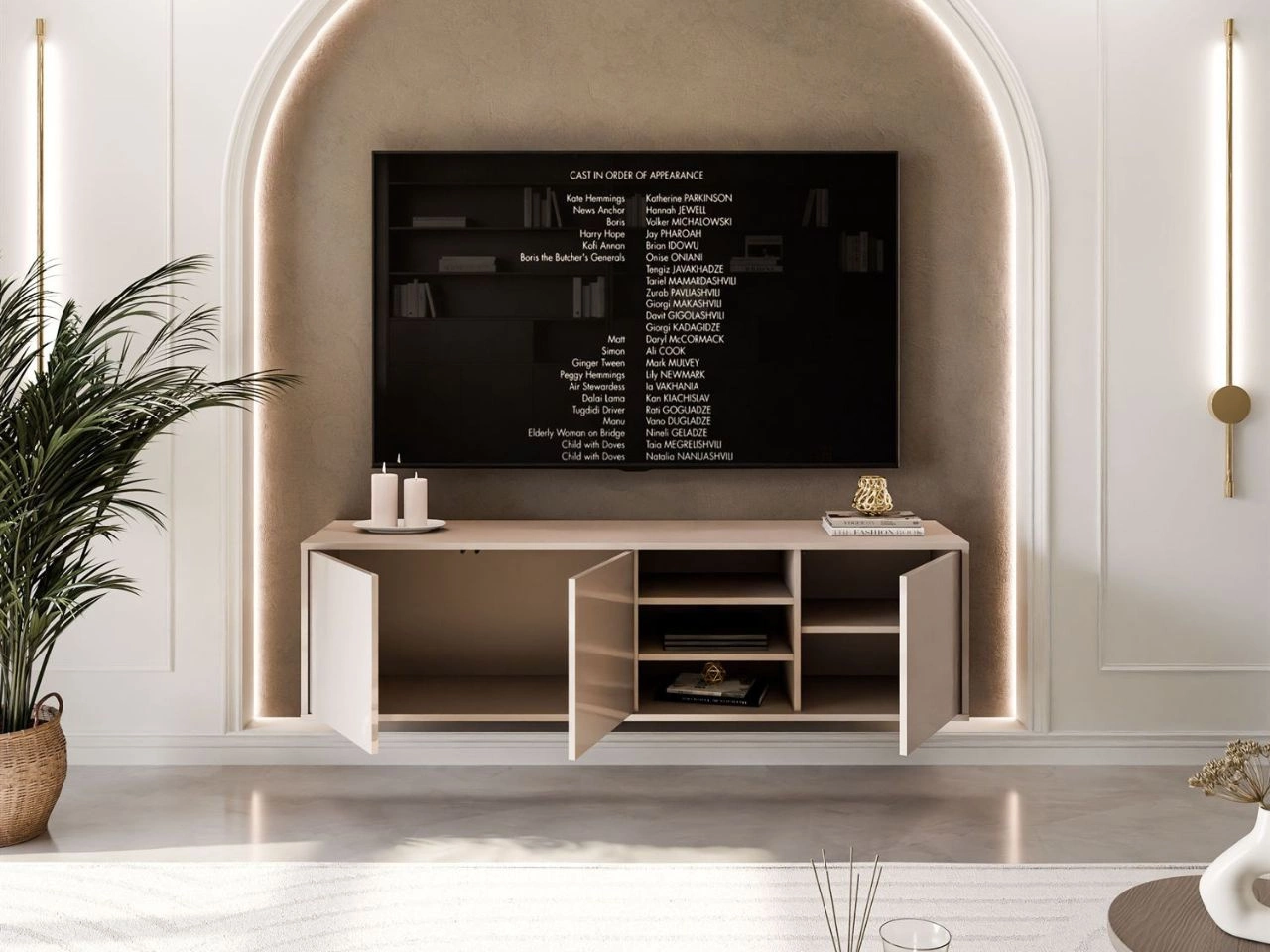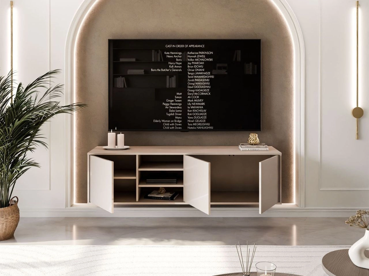 Kaszmirowa czterodrzwiowa szafka RTV Vivance wisząca została stworzona w taki sposób, aby można było dopasować ją do własnych preferencji. Co to oznacza? Wraz z meblem otrzymujemy w zestawie cztery fronty drzwiowe, ale nie trzeba ich wszystkich montować. Konstrukcja meble pozwala na pozostawienie otwartej wnęki z półkami w środkowej części - po lewej lub prawej stronie. Można mieś zatem szafkę cztero- lub trzydrzwiową. Mebel posiada dwie mniejsze wnęki i jedną większą. Znajdziemy tu też trzy półki. Drzwiczki wyposażono w bezuchwytowy system otwierania Push To Open - naciśnij, aby otworzyć.