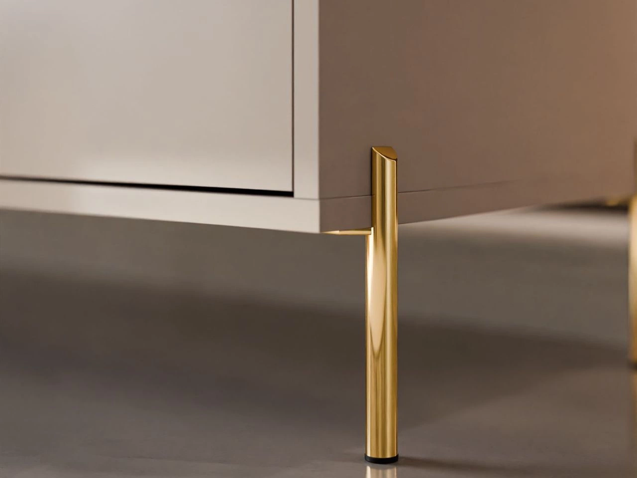 Komoda Vivance posiada fronty wykończone na wysoki połysk, podczas gdy korpus utrzymany jest w stonowanym macie. Bryła ustawiona jest na metalowych nogach w złotym kolorze. Znajdziemy tutaj również dodatkową centralną nóżkę, która stabilizuje konstrukcje i pomaga w równomiernym rozłożeniu masy.
