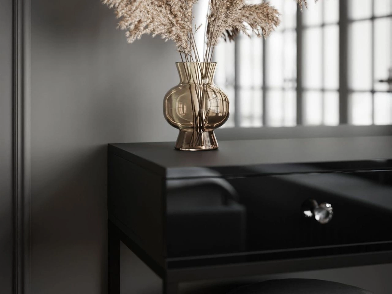 Wyposażona w dwie pojemne szuflady z kryształowymi uchwytami, osadzone na prowadnicach kulkowych z pełnym wysuwem, toaletka Clarette pozwala wygodnie przechowywać kosmetyki, akcesoria i drobiazgi, ułatwiając utrzymanie porządku. Stabilna podstawa w eleganckim wykończeniu podkreśla lekkość konstrukcji, a jednocześnie wprowadza do przestrzeni nutę luksusu i harmonii. To idealny wybór dla osób, które chcą połączyć estetykę z praktycznością.