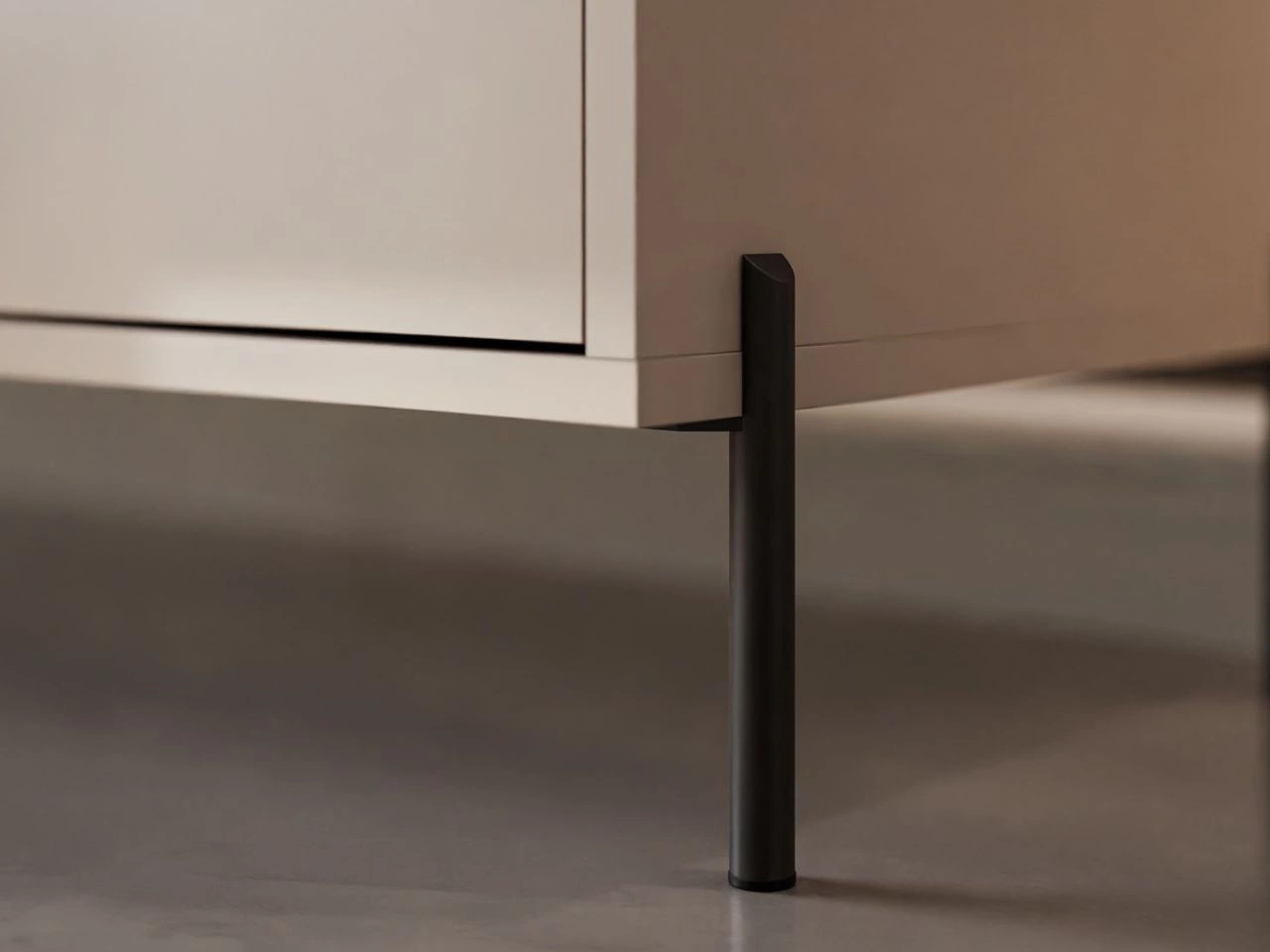 Komoda Vivance posiada fronty wykończone na wysoki połysk, podczas gdy korpus utrzymany jest w stonowanym macie. Bryła ustawiona jest na metalowych nogach w czarnym kolorze. Znajdziemy tutaj również dodatkową centralną nóżkę, która stabilizuje konstrukcje i pomaga w równomiernym rozłożeniu masy.