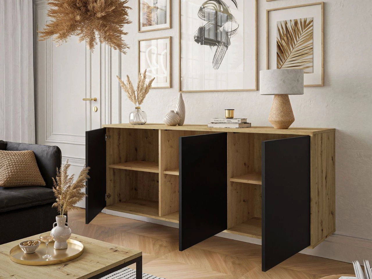 Trzydrzwiowa komoda 154 cm w stylu loft wisząca Vivance czarny mat i dąb artisan