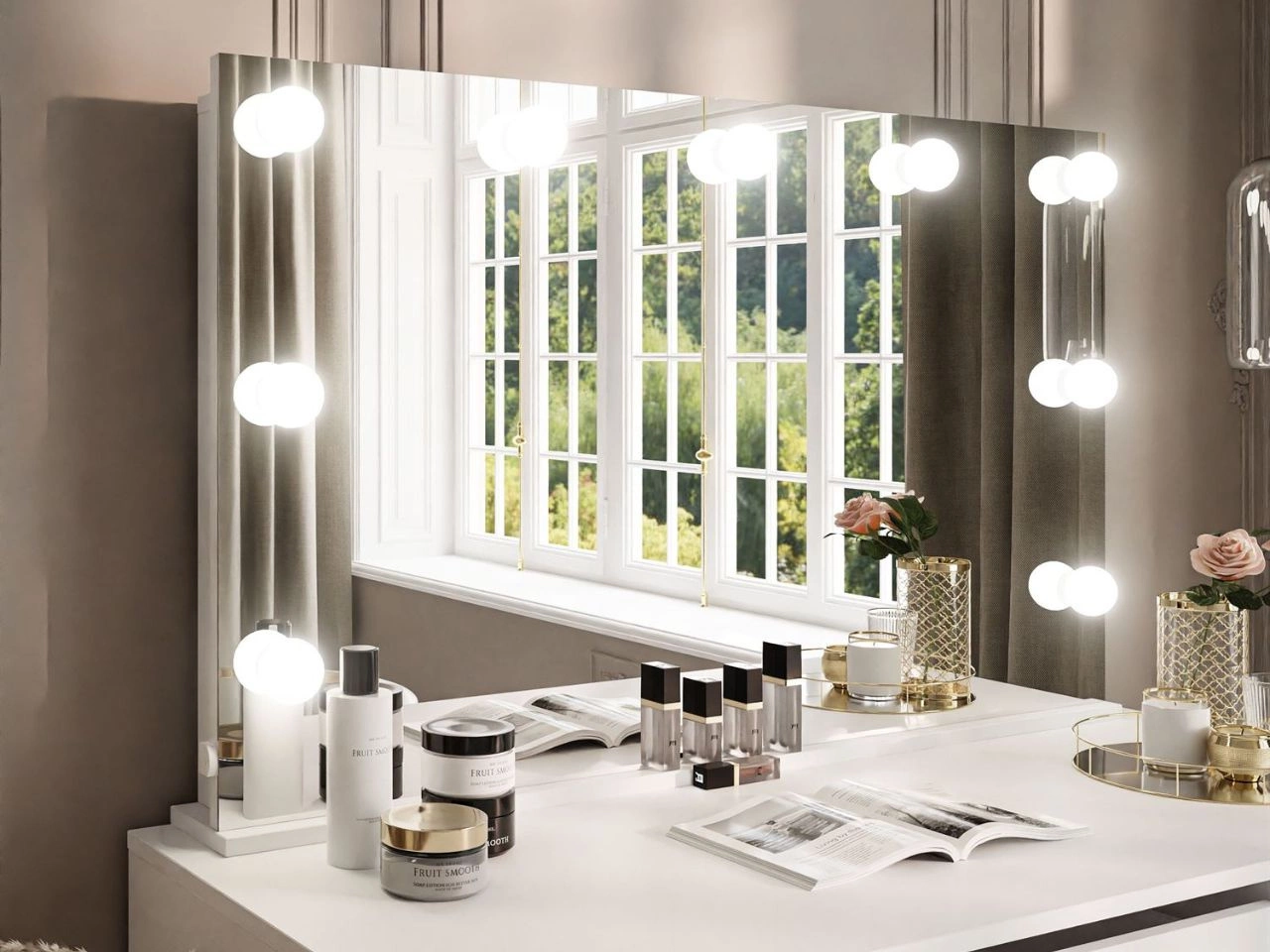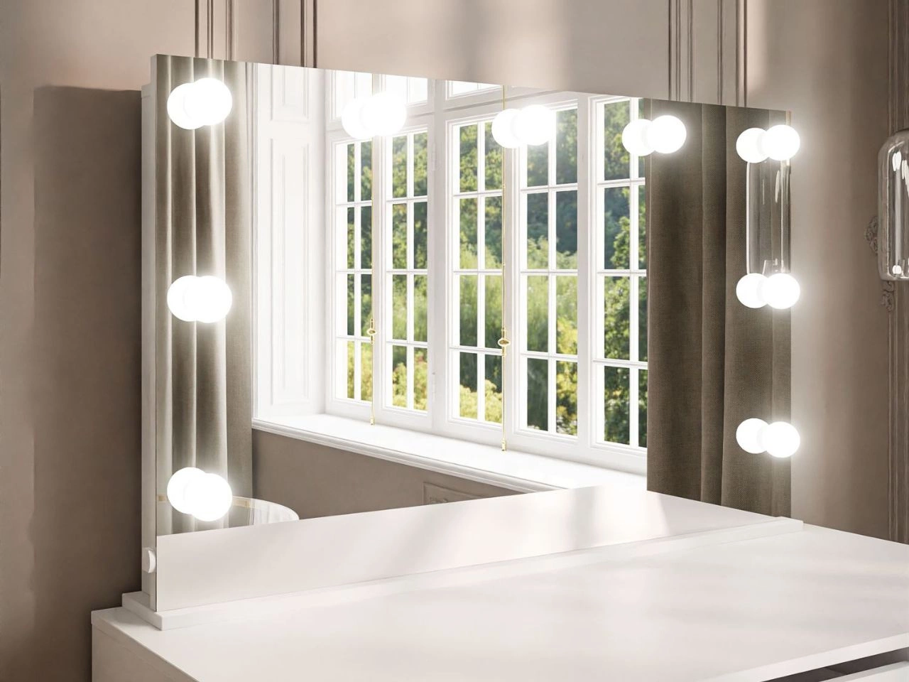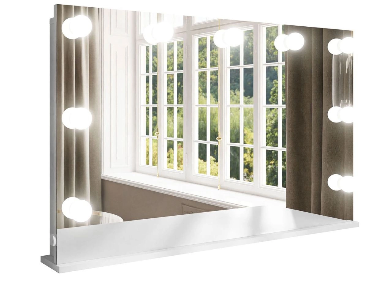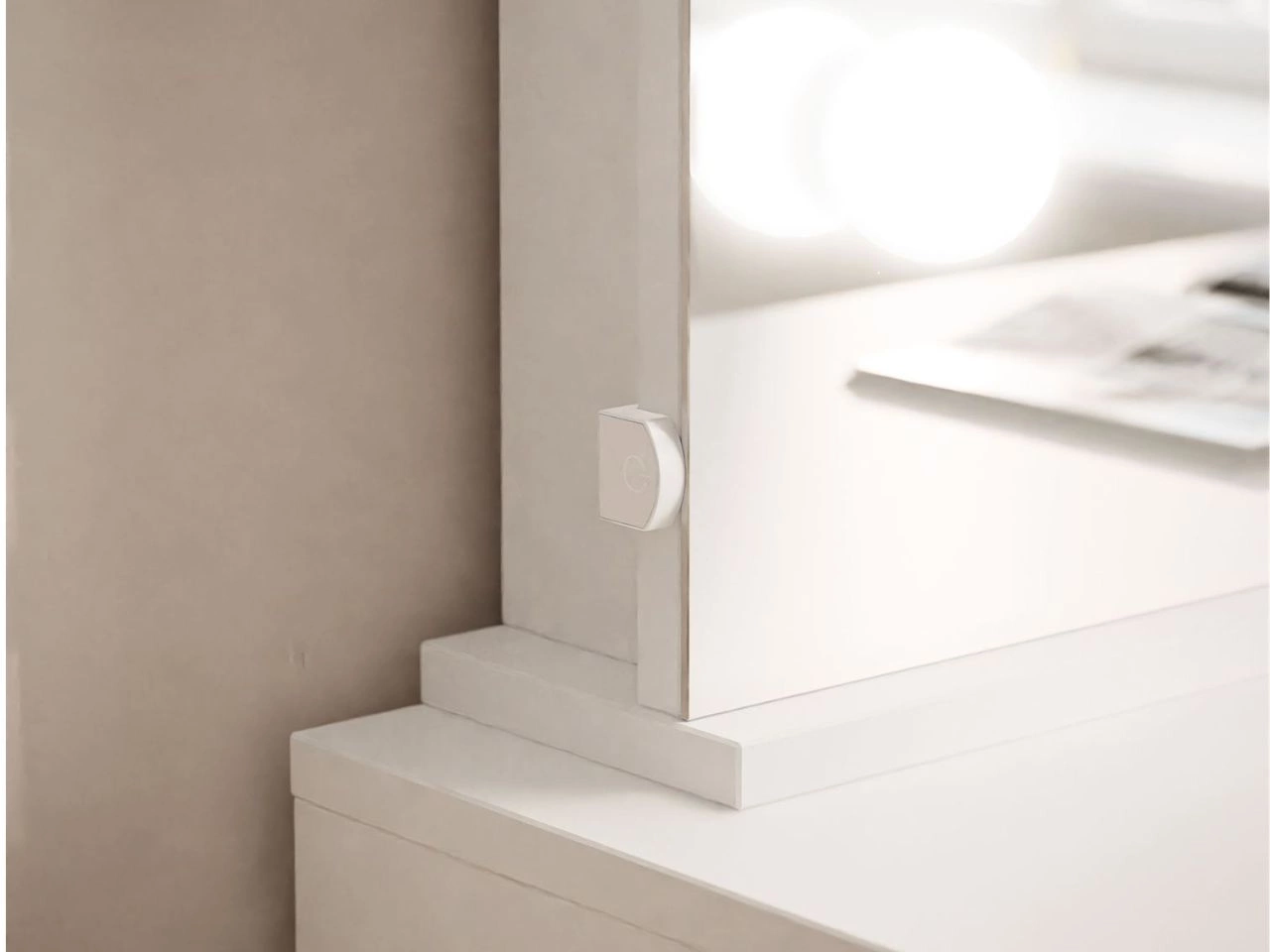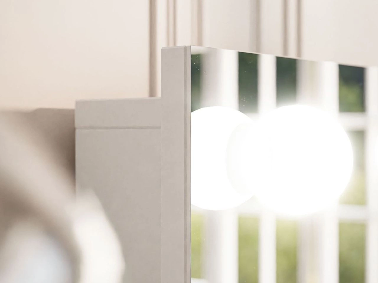 Niewątpliwym atutem toaletki Melo Elite jest jej duże lustro, otoczone dziewięcioma punktami świetlnymi LED. Emitują one naturalne, przyjemne dla oczu światło, które idealnie nadaje się do makijażu. Oświetlenie LED zasilane jest przewodem podłączanym do gniazdka sieciowego.