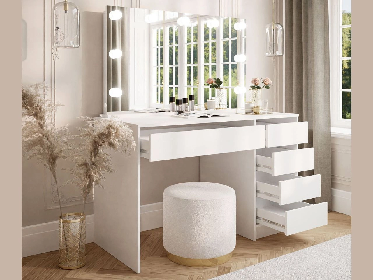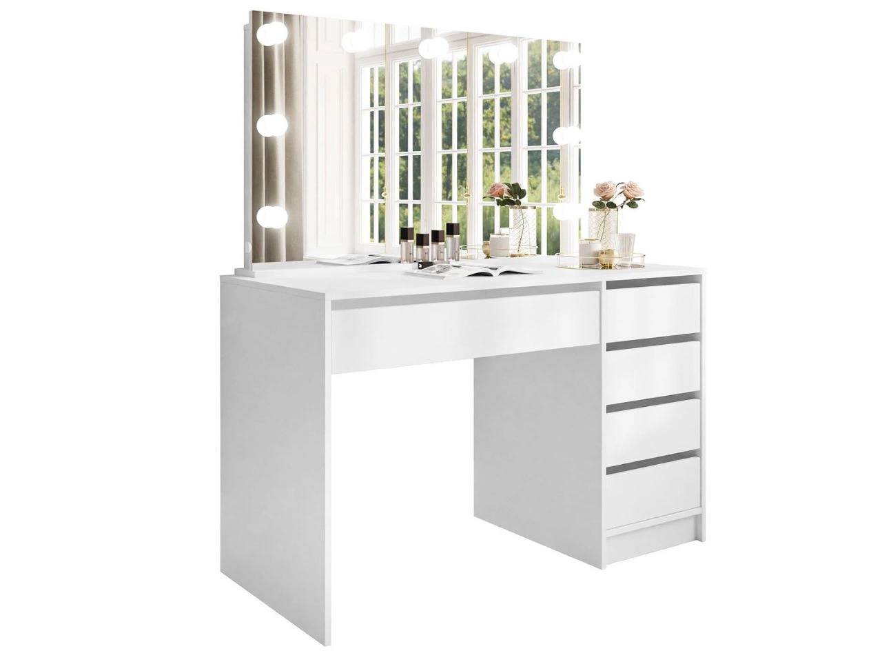 Konstrukcja toaletki Melo Elite została wykonana z wysokiej jakości płyty laminowanej, której obrzeża wzmocniono okleiną ABS. Zastosowanie tego materiału chroni mebel przed zarysowaniami i drobnymi uszkodzeniami. Pod szerokim blatem rozmieszczono pięć pojemnych szuflad, idealnych na akcesoria kosmetyczne i biżuterię. Szuflady wyposażono w prowadnice kulkowe, co zapewnia płynne i pełne wysuwanie. Dodatkowym atutem jest możliwość montażu szuflad po lewej lub prawej stronie biurka - zależnie od preferencji użytkownika.