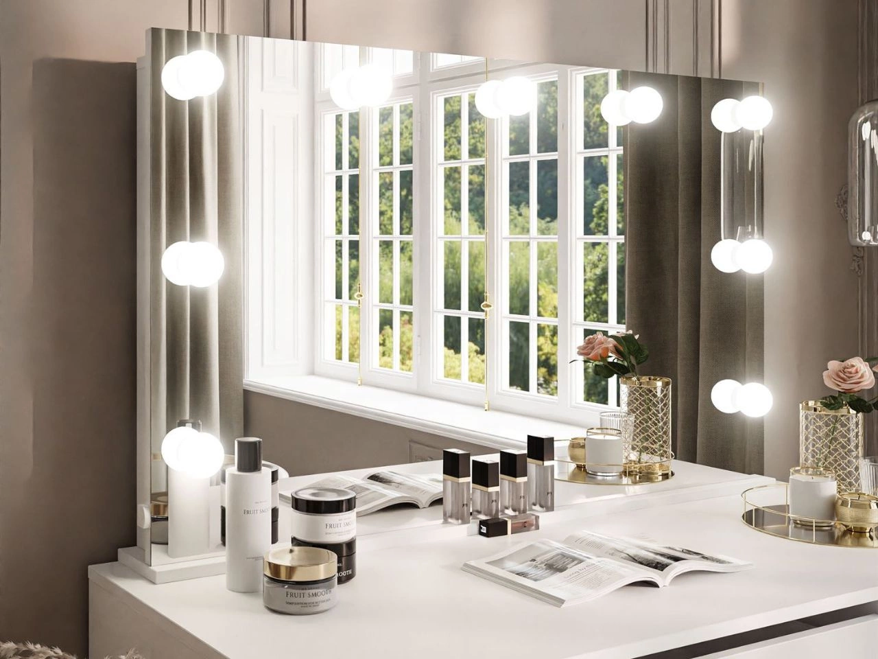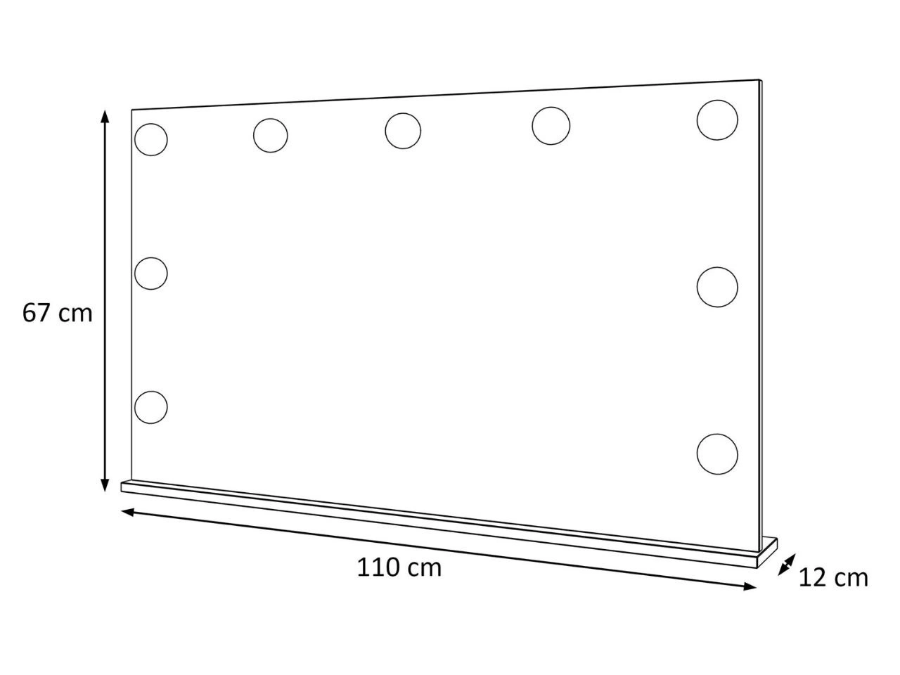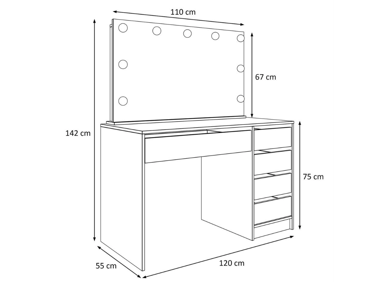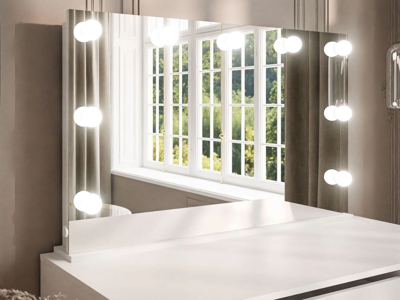 Niewątpliwym atutem toaletki Melo Elite jest jej duże lustro, otoczone dziewięcioma punktami świetlnymi LED. Emitują one naturalne, przyjemne dla oczu światło, które idealnie nadaje się do makijażu. Oświetlenie LED zasilane jest przewodem podłączanym do gniazdka sieciowego.