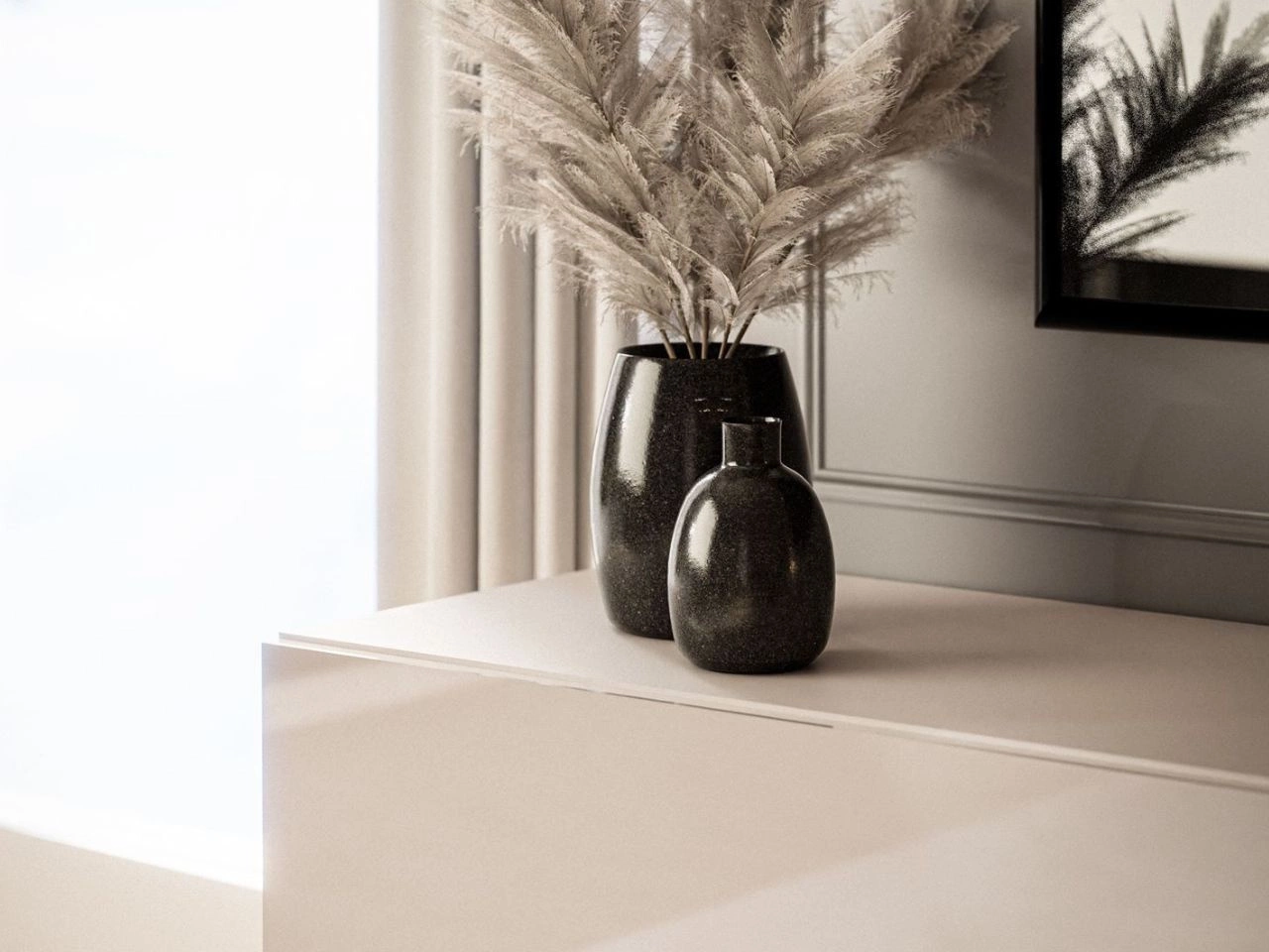 Komoda RTV Aurelie została wykonana z płyty laminowanej i zabezpieczona obrzeżem ABS, które chroni krawędzie przed uszkodzeniami, wydłużając trwałość mebla. Czarne, metalowe nóżki nadają szafce nowoczesnego, lekkiego charakteru, a oświetlenie LED w chłodnej bieli subtelnie podkreśla jej design. Front wykończono na wysoki połysk w kolorze kaszmiru, co dodaje elegancji i prestiżu. Uchylna klapa otwierana w dół, wspierana siłownikami, zapewnia wygodny dostęp do wnętrza. Mechanizm push-to-open pozwala otworzyć front jednym lekkim naciśnięciem – bez uchwytów i zaburzania minimalistycznej linii.