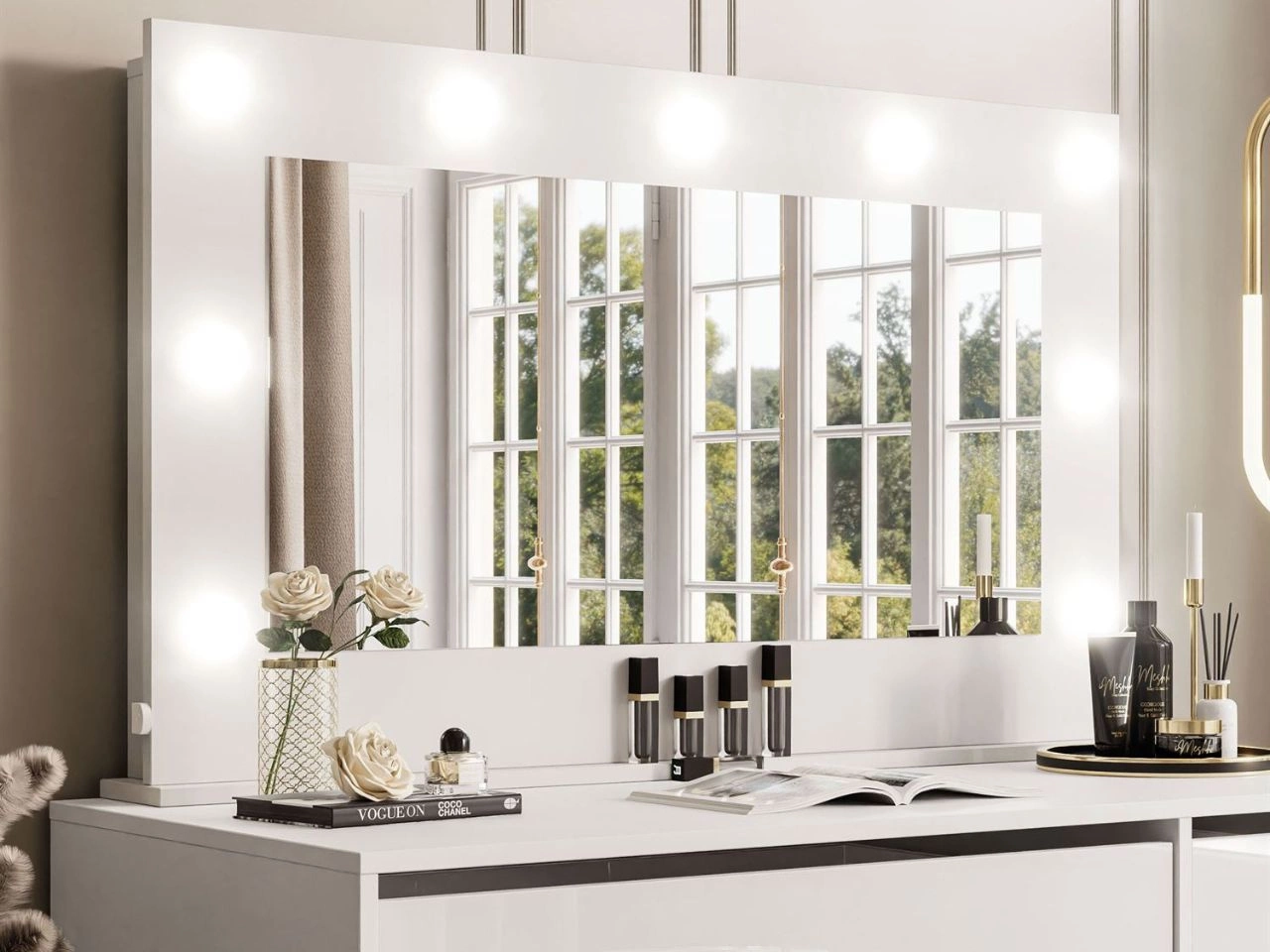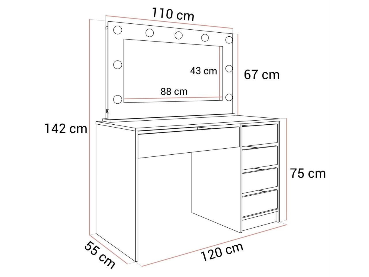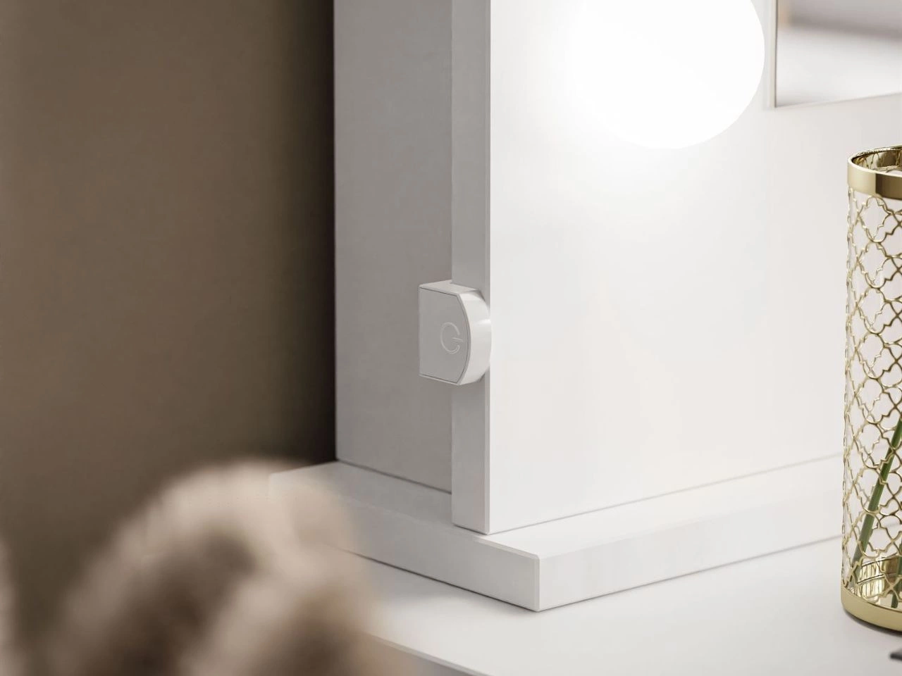 Największą ozdobą toaletki Melo jest duże lustro w białej ramie, otoczone dziewięcioma punktami świetlnymi LED. Zapewniają one naturalne, łagodne światło, które idealnie sprawdza się podczas wykonywania makijażu. Oświetlenie LED podłączane jest do gniazdka sieciowego za pomocą przewodu dołączonego do zestawu.