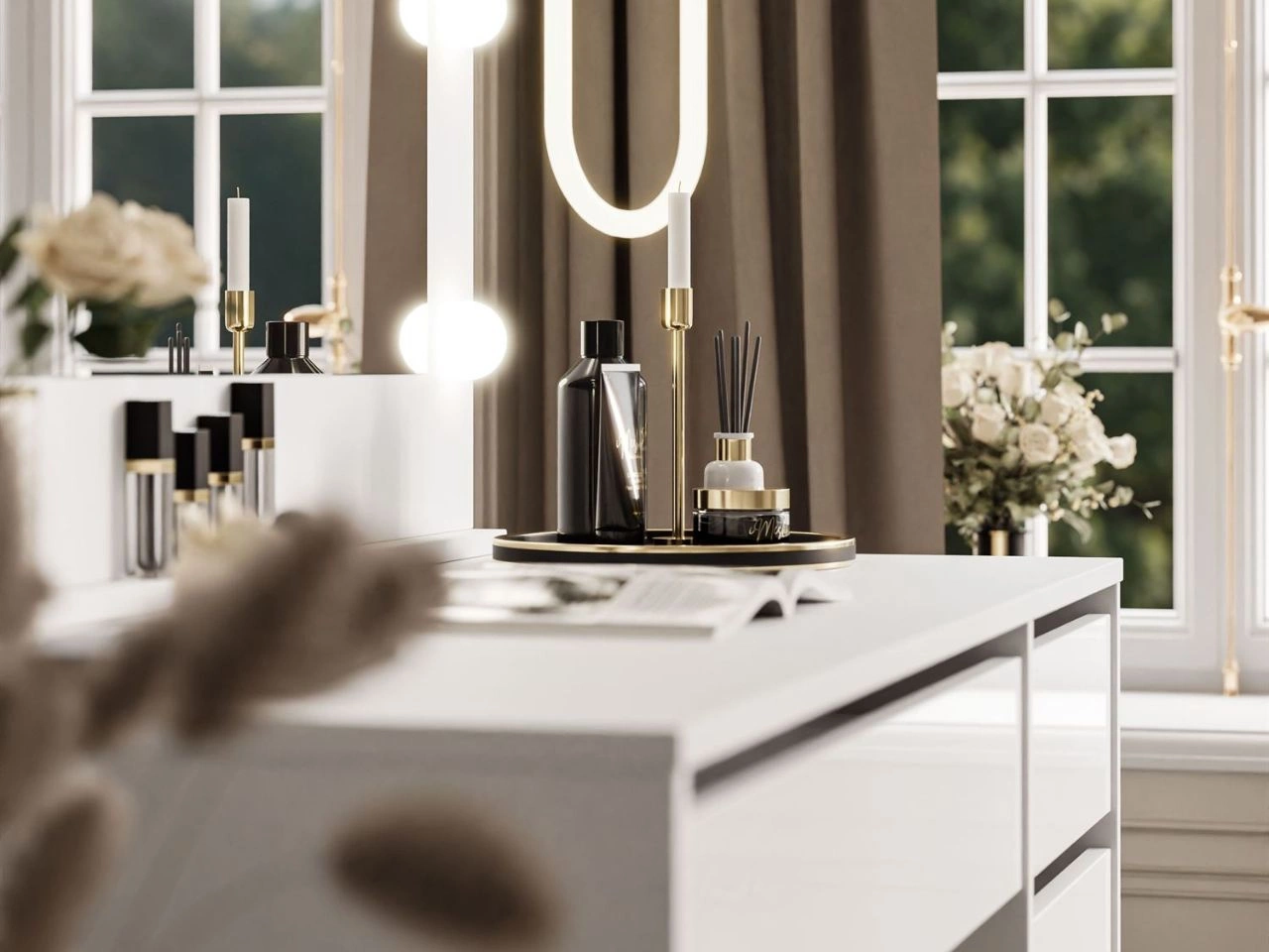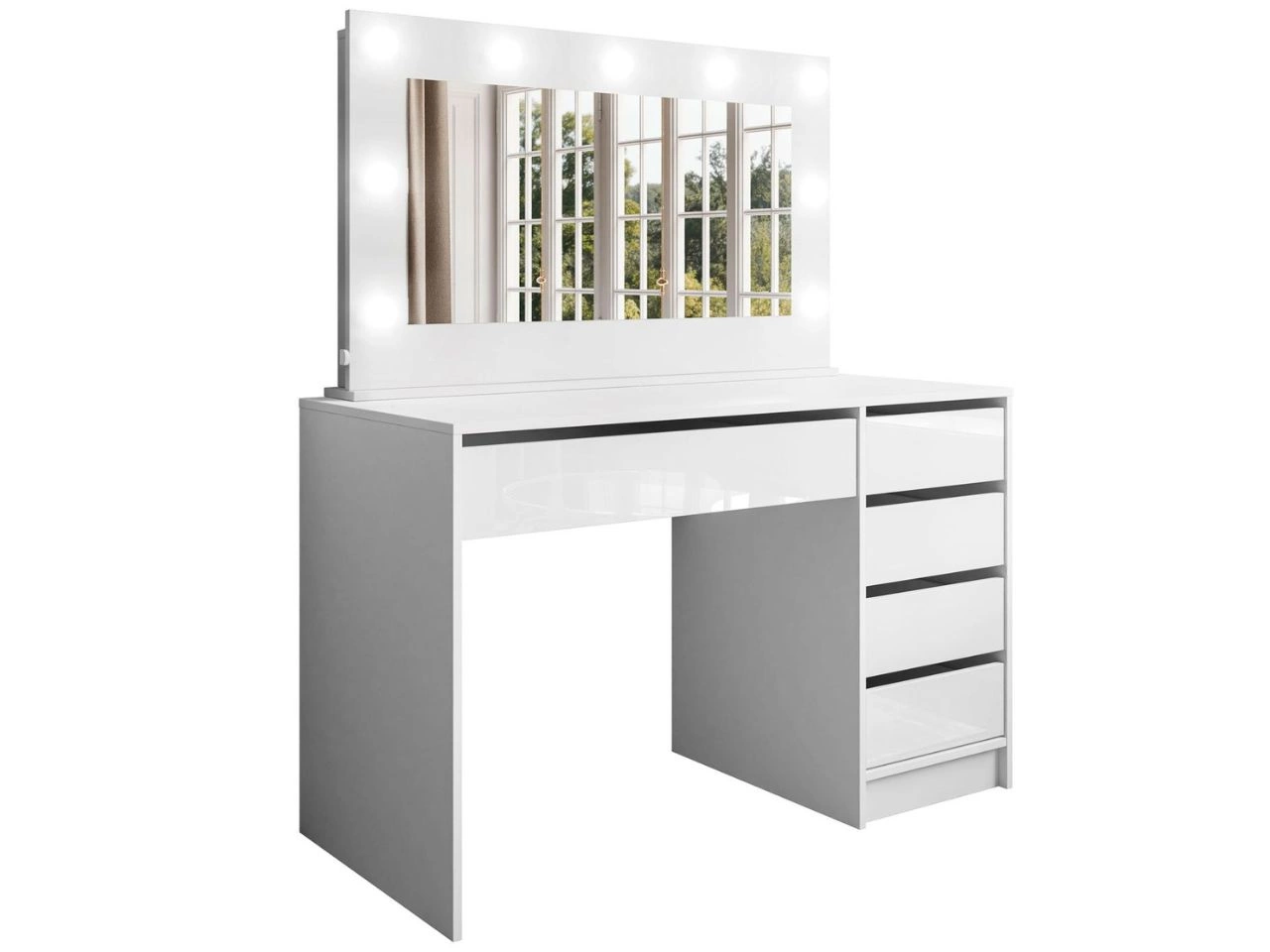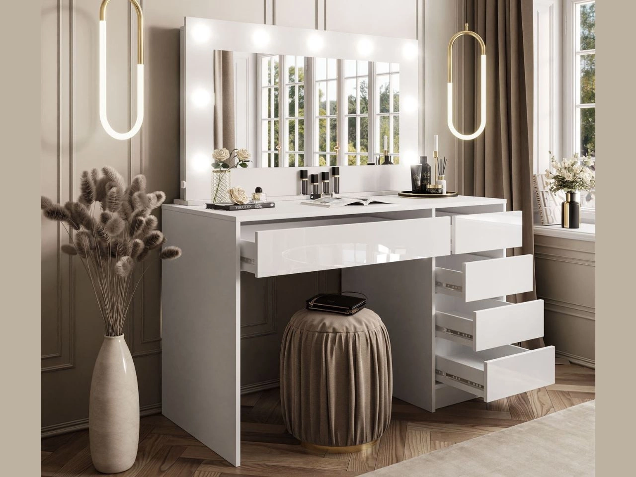 Toaletka glamour z lustrem, szufladami i oświetleniem LED Melo biały połysk