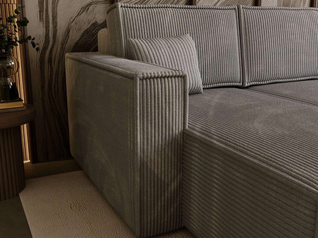 Narożnik Prato L to elegancki mebel wypoczynkowy w stylu nowoczesnym, który idealnie łączy wygodę z funkcjonalnością. Wykończony w tkaninie sztruksowej Poso 55 wprowadza do wnętrza przytulny i modny charakter. Delikatna faktura materiału podkreśla miękkość mebla i sprawia, że staje się on centralnym punktem salonu.