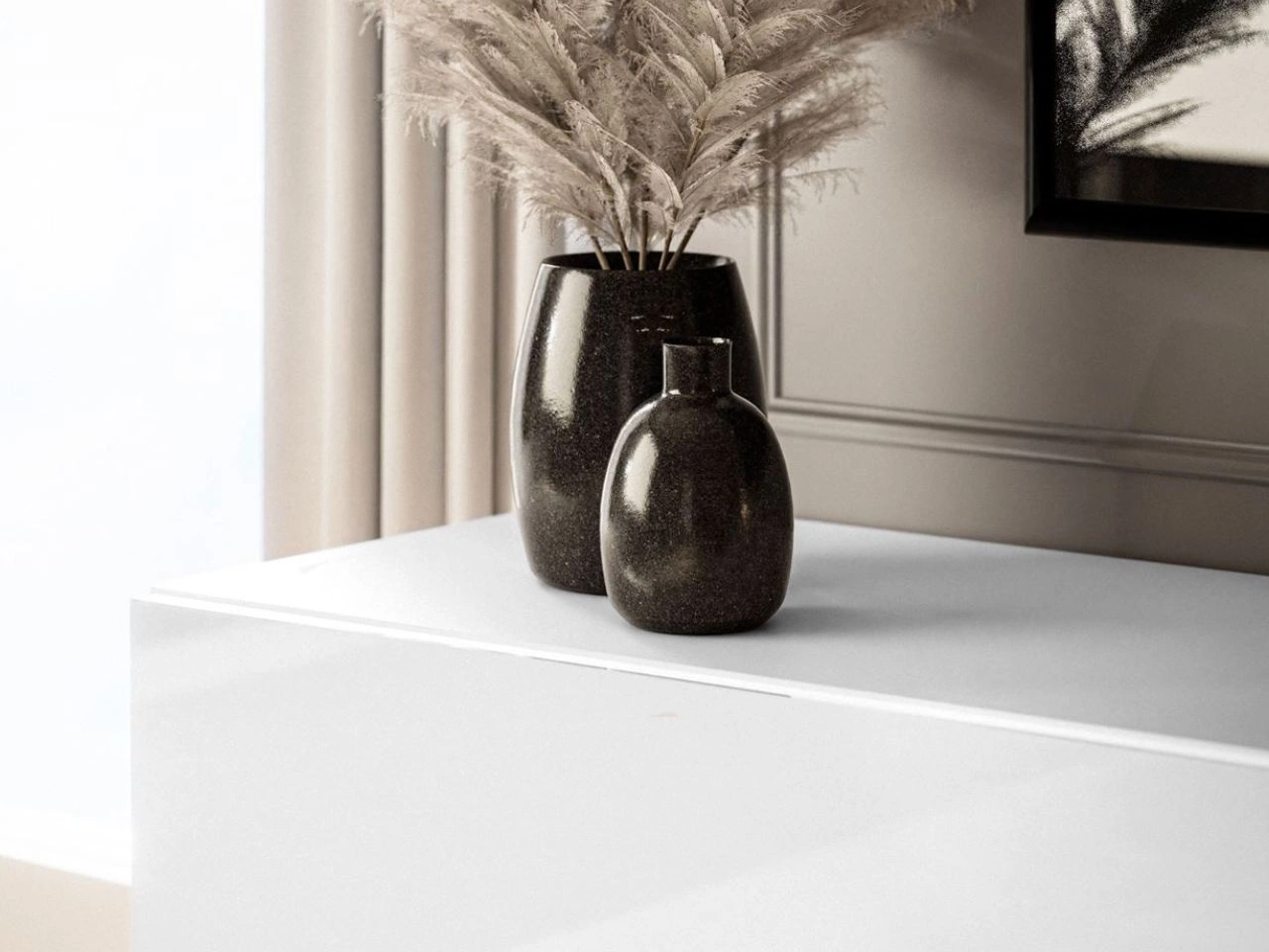 Szafka RTV do salonu została zaprojektowana z myślą o trwałości i wyjątkowym wyglądzie. Solidna płyta laminowana wykończona obrzeżem ABS, skutecznie chroni krawędzie i gwarantuje odporność na codzienne użytkowanie. Korpus w eleganckim białym macie zestawiono z frontami w wysokim połysku, co daje efekt nowoczesnej lekkości i nadaje wnętrzu wyrafinowanego charakteru.