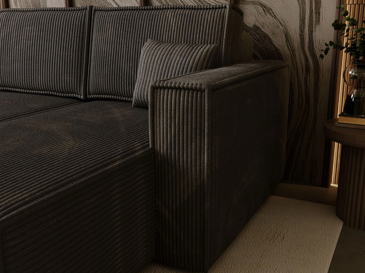 Narożnik Prato L to elegancki mebel wypoczynkowy w stylu nowoczesnym, który idealnie łączy wygodę z funkcjonalnością. Wykończony w tkaninie sztruksowej Poso 60 wprowadza do wnętrza przytulny i modny charakter. Delikatna faktura materiału podkreśla miękkość mebla i sprawia, że staje się on centralnym punktem salonu.