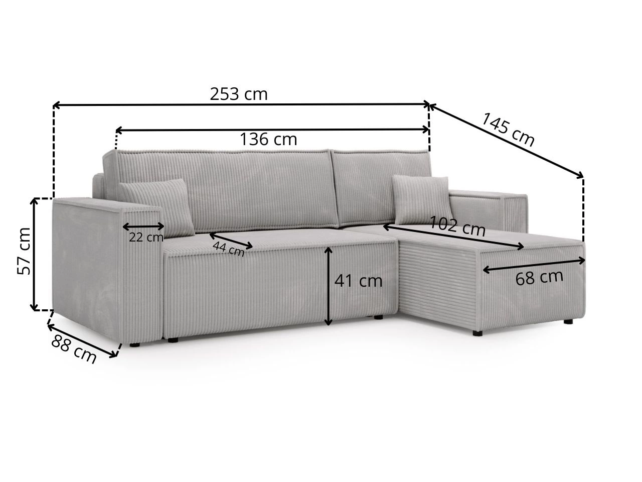 Stabilność mebla zapewniają czarne nóżki o wysokości 2,5 cm, a szerokie boki świetnie sprawdzą się jako podłokietniki które zwiększają komfort codziennego użytkowania. Dzięki starannemu wykonaniu narożnik łączy nowoczesny design z trwałością, czyniąc go doskonałym wyborem do współczesnych wnętrz.