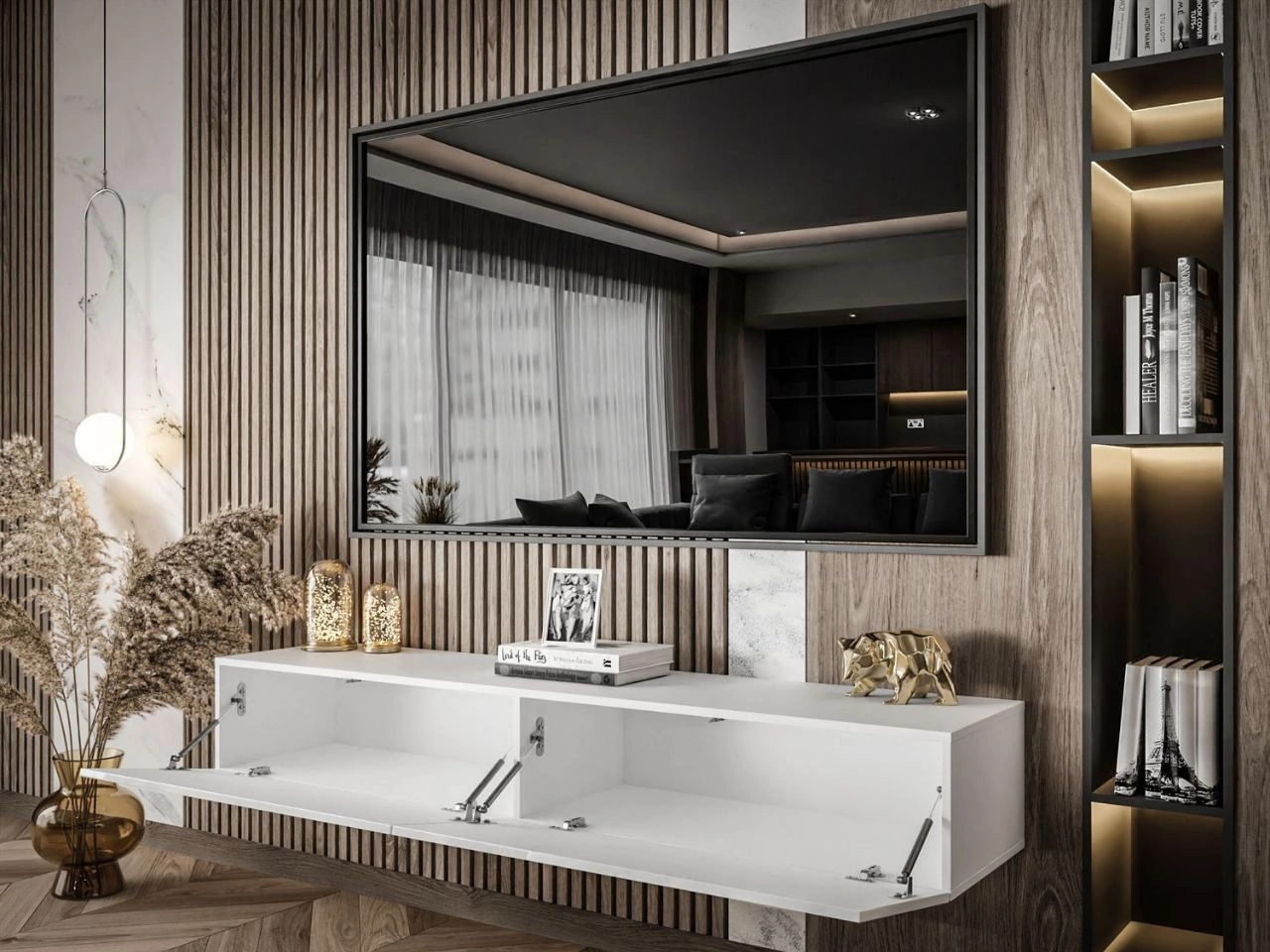 Wiszaąca szafka telewizyjna Sorelle o szerokości 175 centymetrów to dobrze zaprojektowany mebel, który pozwoli Ci ustawić na nim nawet bardzo duży telewizor. Świetny design idzie tu w parze z doskonałą jakością użytych materiałów. Szafka została zbudowana z wysokiej klasy płyty laminowanej, której obrzeża zabezpieczono dodatkowo okleiną ABS, chroniącą przed powstawaniem drobnych uszkodzeń mechanicznych. Znajdziemy tu dwie wnęki ukryte za uchylnymi drzwiczkami z systemem PUSH TO OPEN (naciśnij, aby otworzyć), dzięki czemu gładkiej powierzchni frontów nie zakłócają żadne elementy. Drzwiczki można zamontować na dwa sposoby - uchylnie ku górze, lub ku dołowi. Aby uniknąć niepotrzebnego trzaskania i swobodnego opadania, fronty wyposażono w praktyczne siłowniki.