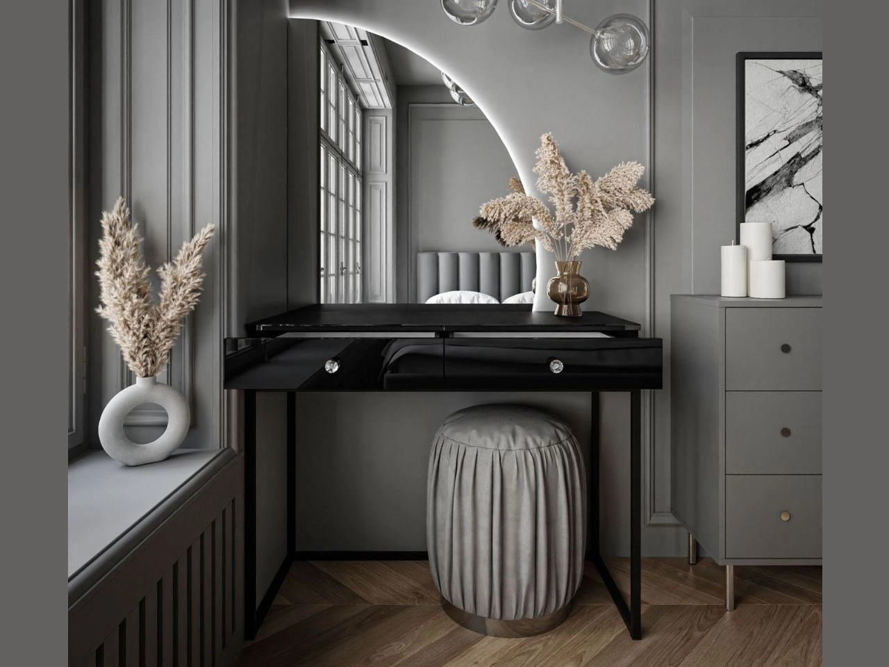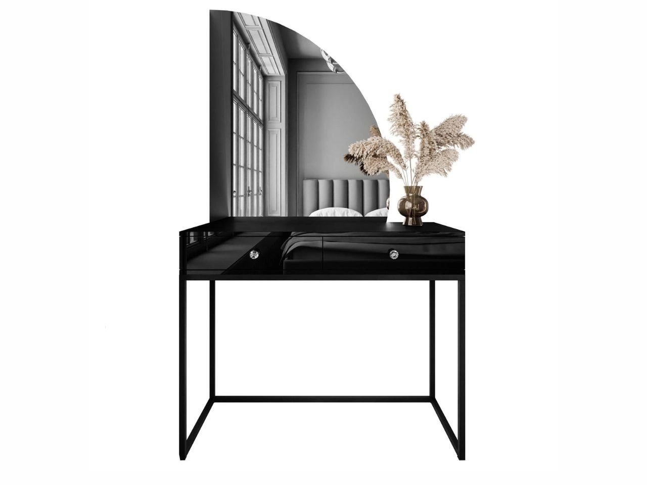 Wyposażona w dwie pojemne szuflady z kryształowymi uchwytami, osadzone na prowadnicach kulkowych z pełnym wysuwem, toaletka Clarette pozwala wygodnie przechowywać kosmetyki, akcesoria i drobiazgi, ułatwiając utrzymanie porządku. Stabilna podstawa w eleganckim wykończeniu podkreśla lekkość konstrukcji, a jednocześnie wprowadza do przestrzeni nutę luksusu i harmonii. To idealny wybór dla osób, które chcą połączyć estetykę z praktycznością.