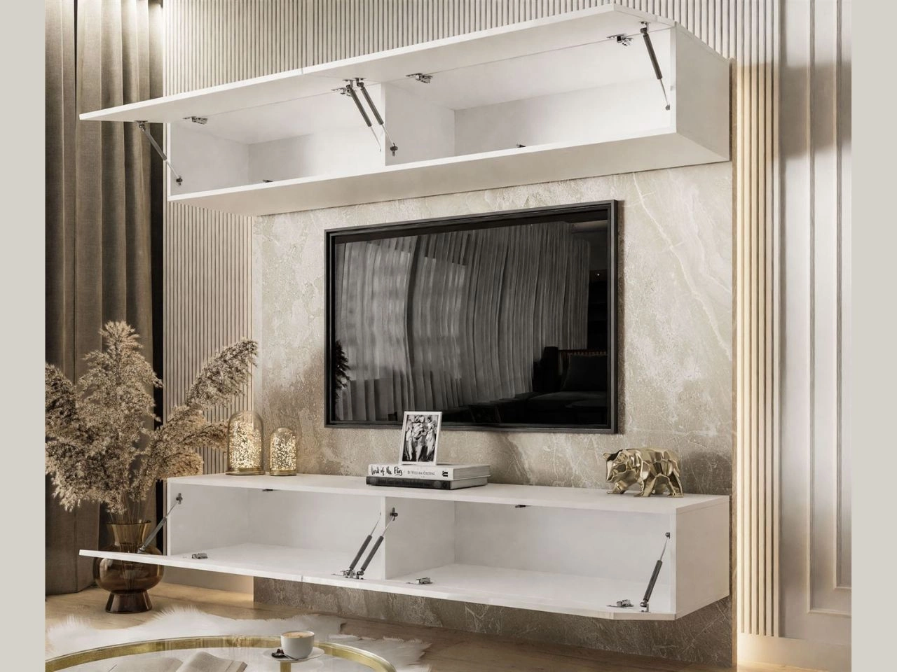 Wisząca meblościanka telewizyjna Sorelle to zespół dwóch brył szerokości 175 centymetrów. Świetny design idzie tu w parze z doskonałą jakością użytych materiałów. Szafki zostały zbudowane z wysokiej klasy płyty laminowanej, której obrzeża zabezpieczono dodatkowo okleiną ABS, chroniącą przed powstawaniem drobnych uszkodzeń mechanicznych. Zarówno w dolnej, jak i górnej szafce znajdziemy dwie wnęki ukryte za uchylnymi drzwiczkami z systemem PUSH TO OPEN (naciśnij, aby otworzyć), dzięki czemu gładkiej powierzchni frontów nie zakłócają żadne elementy. Drzwiczki można zamontować na dwa sposoby - uchylnie ku górze, lub ku dołowi. Aby uniknąć niepotrzebnego trzaskania i swobodnego opadania, fronty wyposażono w praktyczne siłowniki.