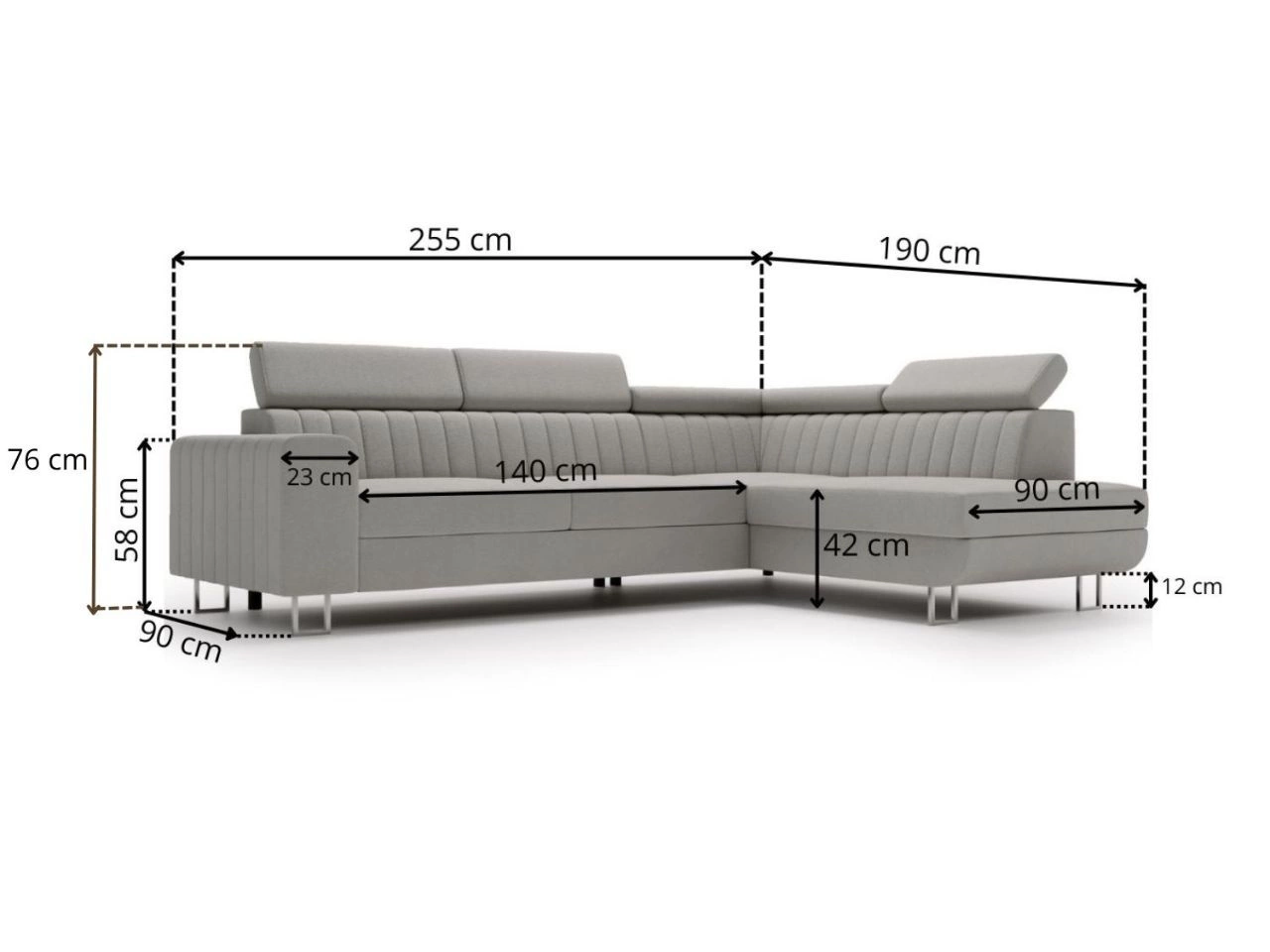 Model w kształcie litery L z lewostronną otomaną oferuje wygodne miejsce do relaksu. Siedzisko o wysokości 42 cm oraz regulowane zagłówki zapewniają wysoki komfort użytkowania. Dzięki starannie zaprojektowanej konstrukcji narożnik może pełnić rolę zarówno codziennego miejsca wypoczynku, jak i dodatkowego łóżka.