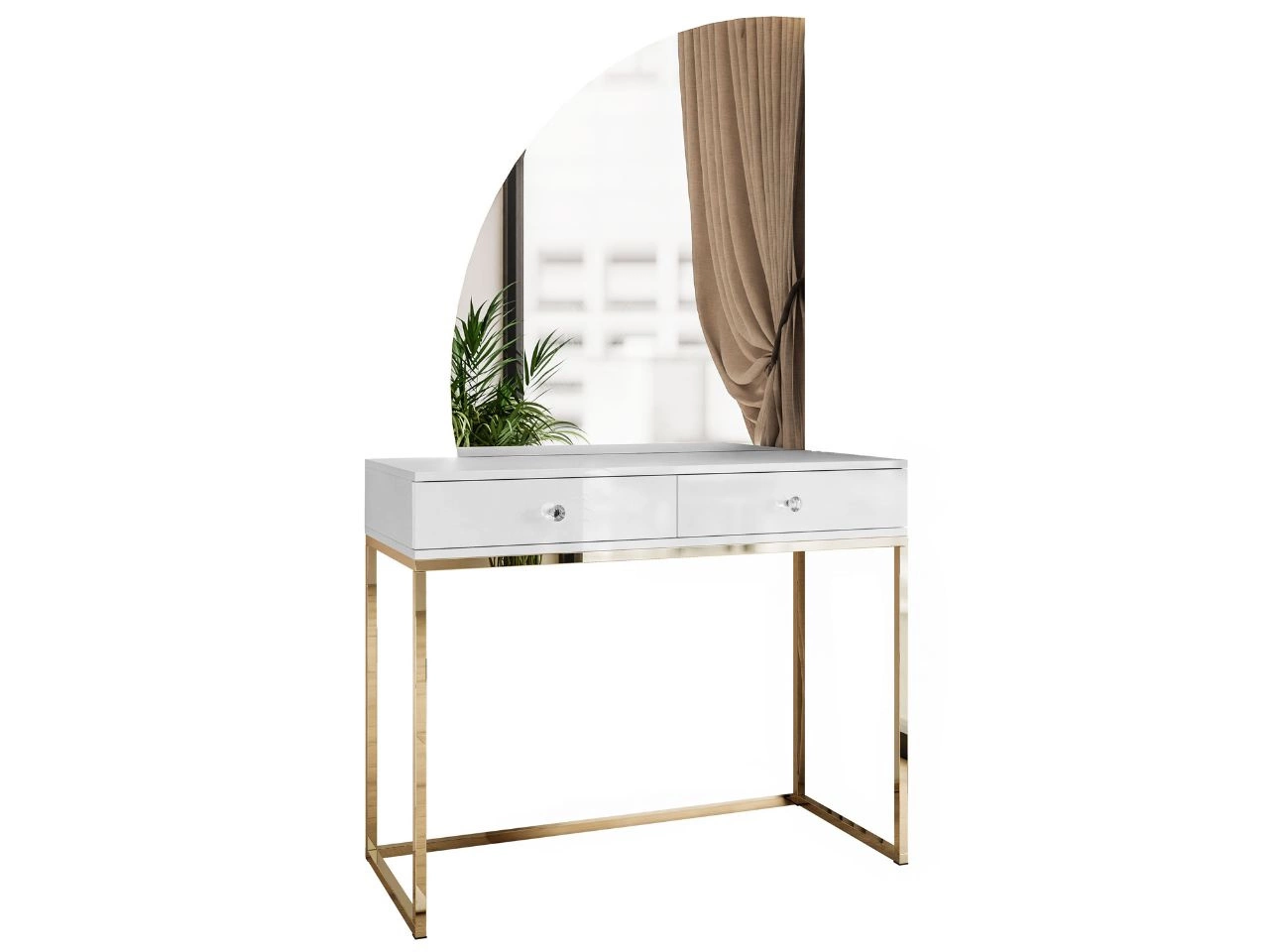 Toaletka kosmetyczna lewostronna z szufladami i oświetleniem LED na złotych nogach Clarette Biały połysk