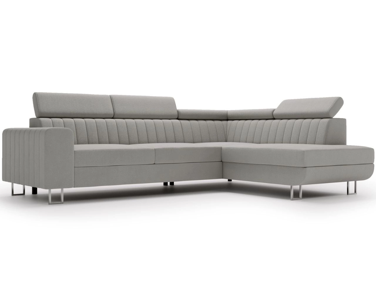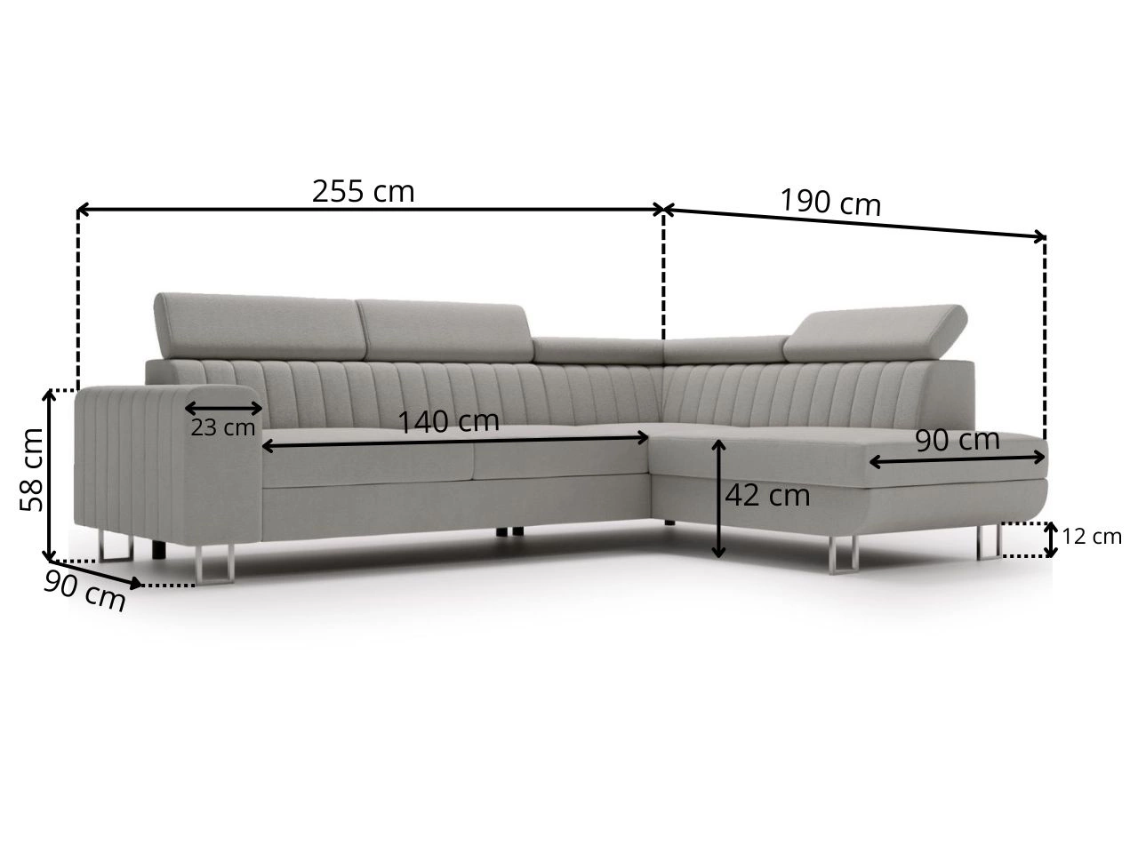 Model w kształcie litery L z prawostronną otomaną oferuje wygodne miejsce do relaksu. Siedzisko o wysokości 42 cm oraz regulowane zagłówki zapewniają wysoki komfort użytkowania. Dzięki starannie zaprojektowanej konstrukcji narożnik może pełnić rolę zarówno codziennego miejsca wypoczynku, jak i dodatkowego łóżka.
