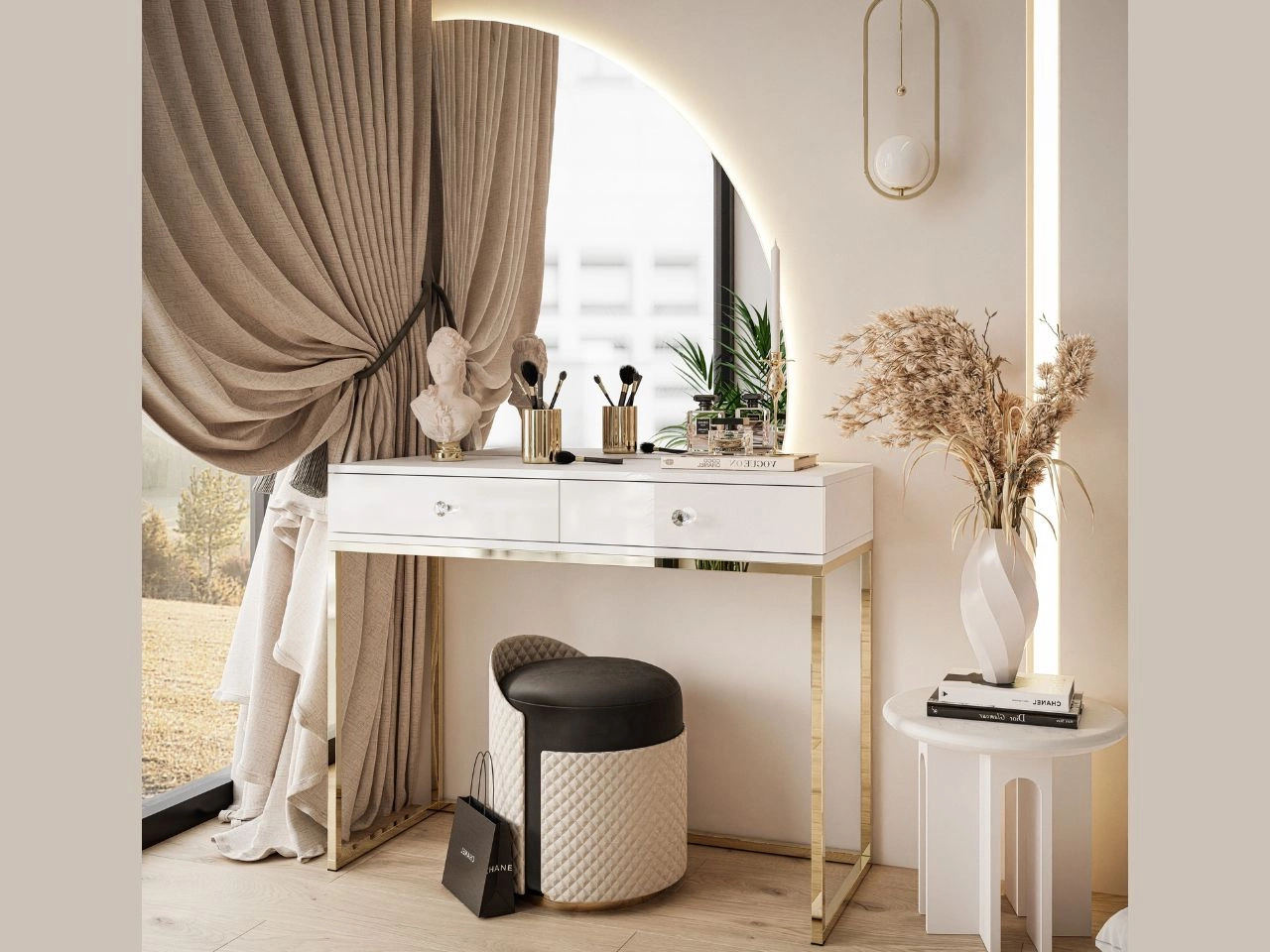 Wyposażona w dwie pojemne szuflady z kryształowymi uchwytami, osadzone na prowadnicach kulkowych z pełnym wysuwem, toaletka Clarette pozwala wygodnie przechowywać kosmetyki, akcesoria i drobiazgi, ułatwiając utrzymanie porządku. Stabilna podstawa w eleganckim wykończeniu podkreśla lekkość konstrukcji, a jednocześnie wprowadza do przestrzeni nutę luksusu i harmonii. To idealny wybór dla osób, które chcą połączyć estetykę z praktycznością.
