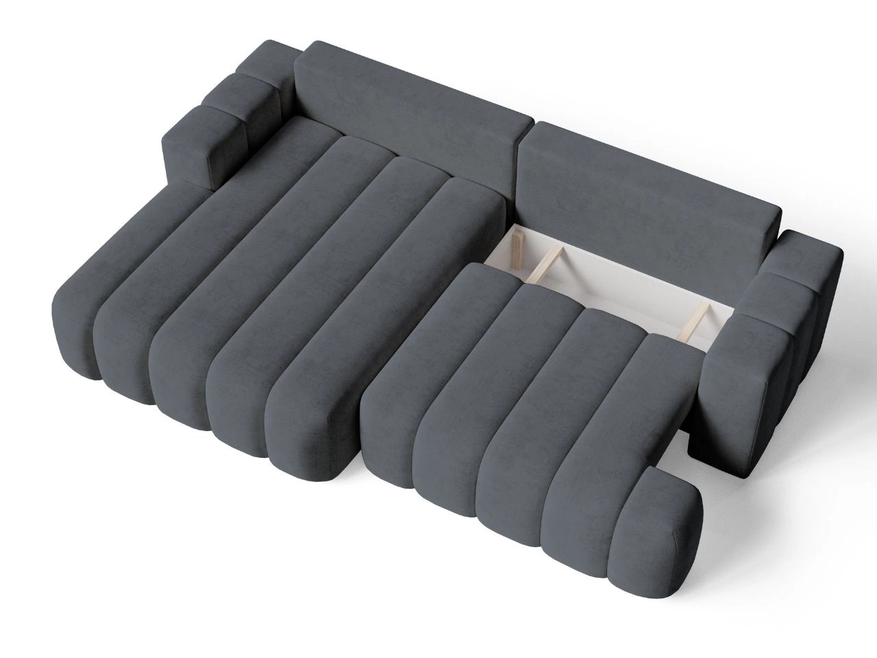 Narożnik został wyposażony w praktyczną funkcję spania, dzięki której w kilka chwil można zamienić go w wygodne łóżko. Dodatkowym atutem jest pojemny schowek na pościel, który ułatwia przechowywanie i pomaga utrzymać porządek w salonie.