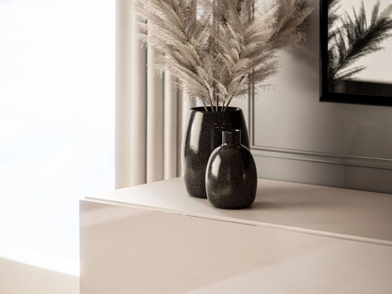 Szafka RTV Aurelie to połączenie solidności i stylu. Mebel wykonano z trwałej płyty laminowanej, a jego krawędzie wzmocniono obrzeżem ABS, które skutecznie chroni przed codziennymi uszkodzeniami. Stabilną konstrukcję przełamują smukłe, czarne metalowe nogi, nadając całości lekkości i nowoczesnego charakteru. Designerskiego wyrazu dodaje także oświetlenie LED w kolorze zimnej bieli, które delikatnie akcentuje elegancką linię mebla. Fronty w kolorze kaszmiru zostały wykończone w efektownym wysokim połysku, dzięki czemu szafka prezentuje się luksusowo. Uchylna klapa otwierana w dół, wspierana siłownikami, gwarantuje wygodę użytkowania, a innowacyjny system push-to-open sprawia, że jednym dotknięciem uzyskasz dostęp do wnętrza – bez uchwytów i bez kompromisów dla minimalistycznej formy.