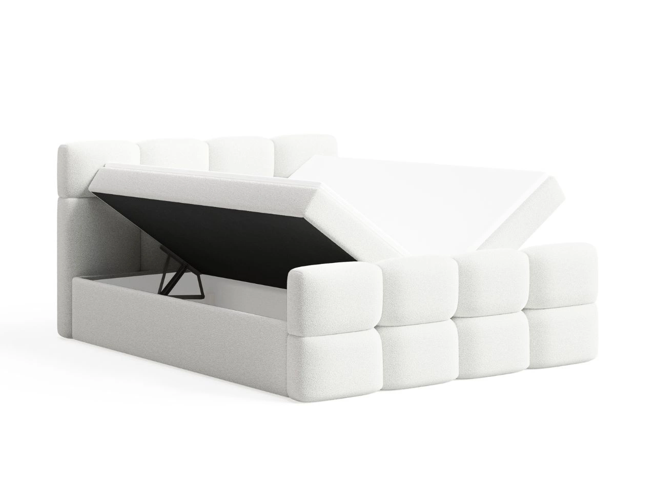 Łóżko Rivon wyposażono w praktyczny, dwudzielny pojemnik na pościel. Mechanizm sprężynowy ułatwia unoszenie stelaża, dzięki czemu dostęp do schowka jest szybki i wygodny. To rozwiązanie sprawia, że łóżko nie tylko podnosi jakość snu, ale także pomaga w utrzymaniu porządku w sypialni.