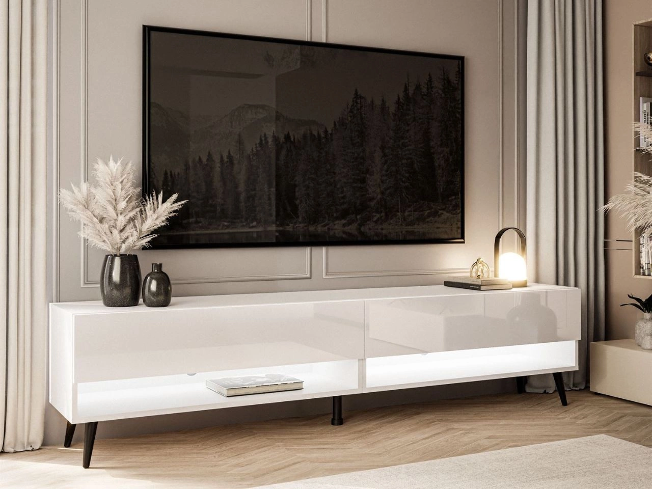 Szafka RTV do salonu 180 cm z czarnymi nóżkami i oświetleniem LED Aurelie Biały połysk