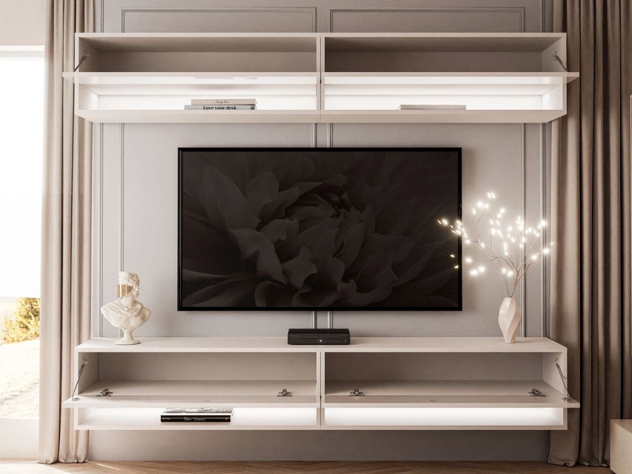 Wisząca meblościanka Aurelie łączy elegancję nowoczesnego designu z funkcjonalnością, idealną do każdego salonu. Fronty w wysokim połysku kontrastują z matowym korpusem, tworząc efektowny, stylowy akcent, który dodaje wnętrzu lekkości i przytulności. Cztery pojemne szafki – dwie górne i dwie dolne – zapewniają przestrzeń do przechowywania, a system push-to-open i uchylne fronty na siłownikach pozwalają otworzyć je jednym lekkim dotknięciem, bez uchwytów.