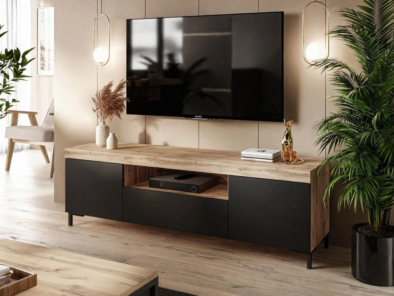 Szafka RTV pod telewizor z drzwiczkami i szufladą Asumi czarny i dąb wotan