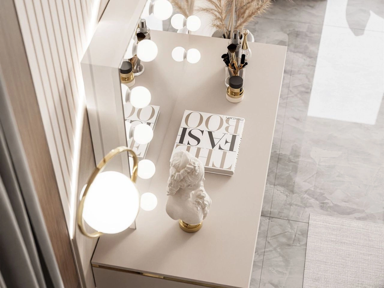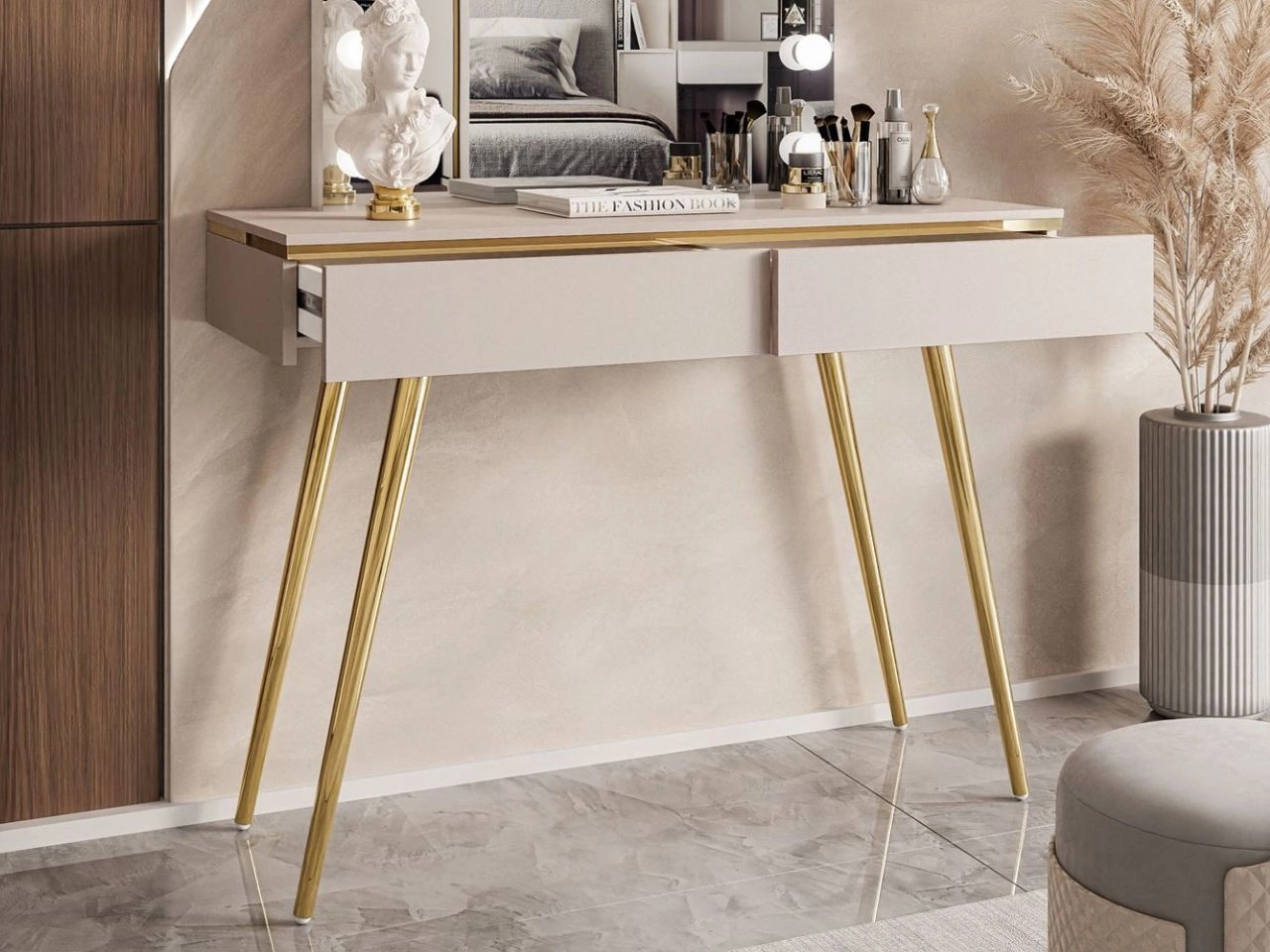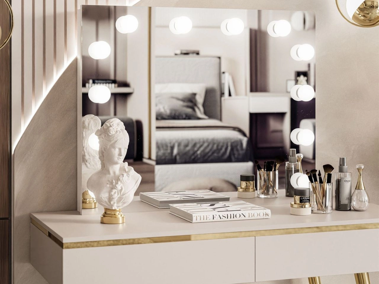 Dobierasz do: Toaletka glamour z szufladami, lustrem i oświetleniem LED na złotych nóżkach Evare Kaszmir