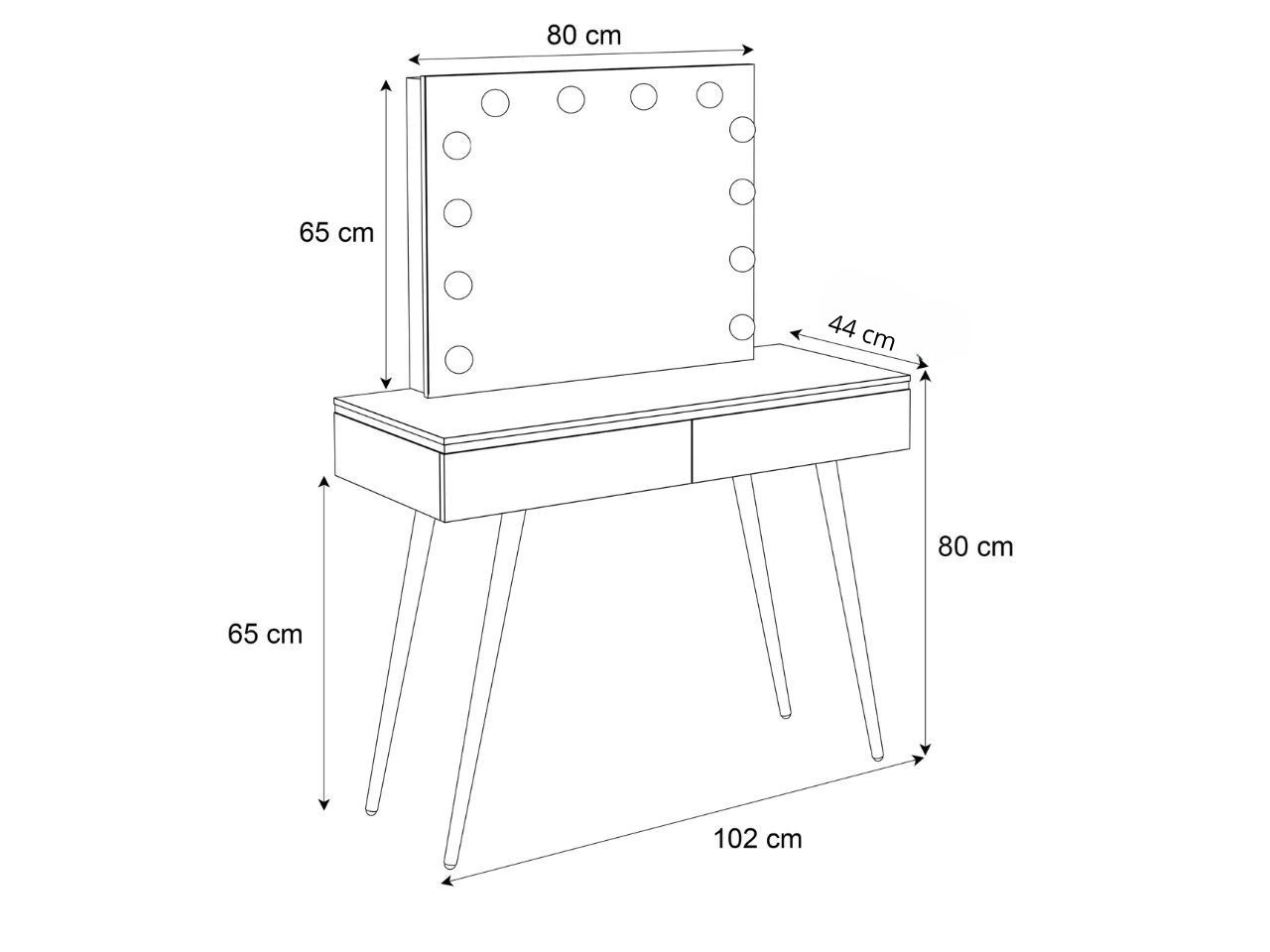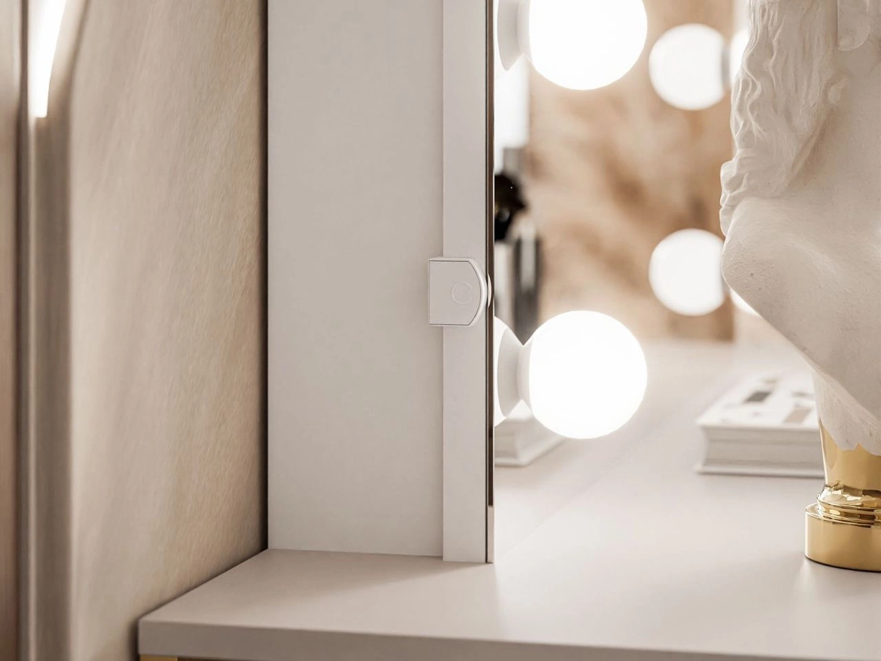 Całość dopełniają złote, chromowane nogi o skośnym kształcie, które nadają meblowi lekkości i nowoczesnego charakteru. Ich połyskujące wykończenie dodaje wnętrzu wyjątkowego blasku, a designerska forma sprawia, że toaletka Evare Elite staje się nie tylko miejscem do pielęgnacji i makijażu, ale także efektownym elementem dekoracyjnym. Dodatkowo duże lustro otoczone dwunastoma żarówkami LED gwarantuje perfekcyjne oświetlenie, podkreślając luksusowy charakter całej kompozycji.