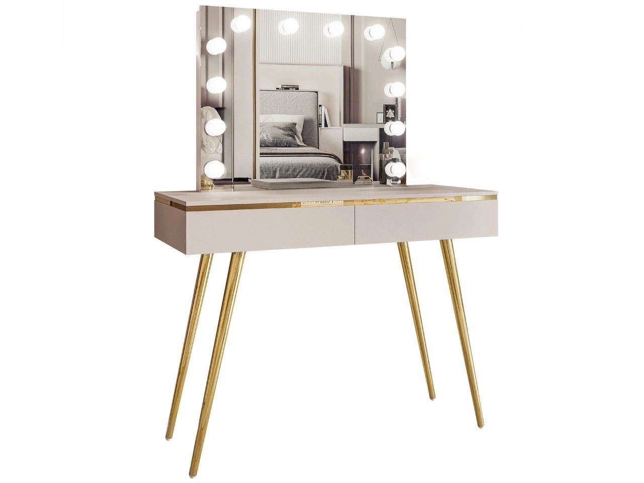 Toaletka glamour z szufladami, lustrem i oświetleniem LED na złotych nóżkach Evare Kaszmir