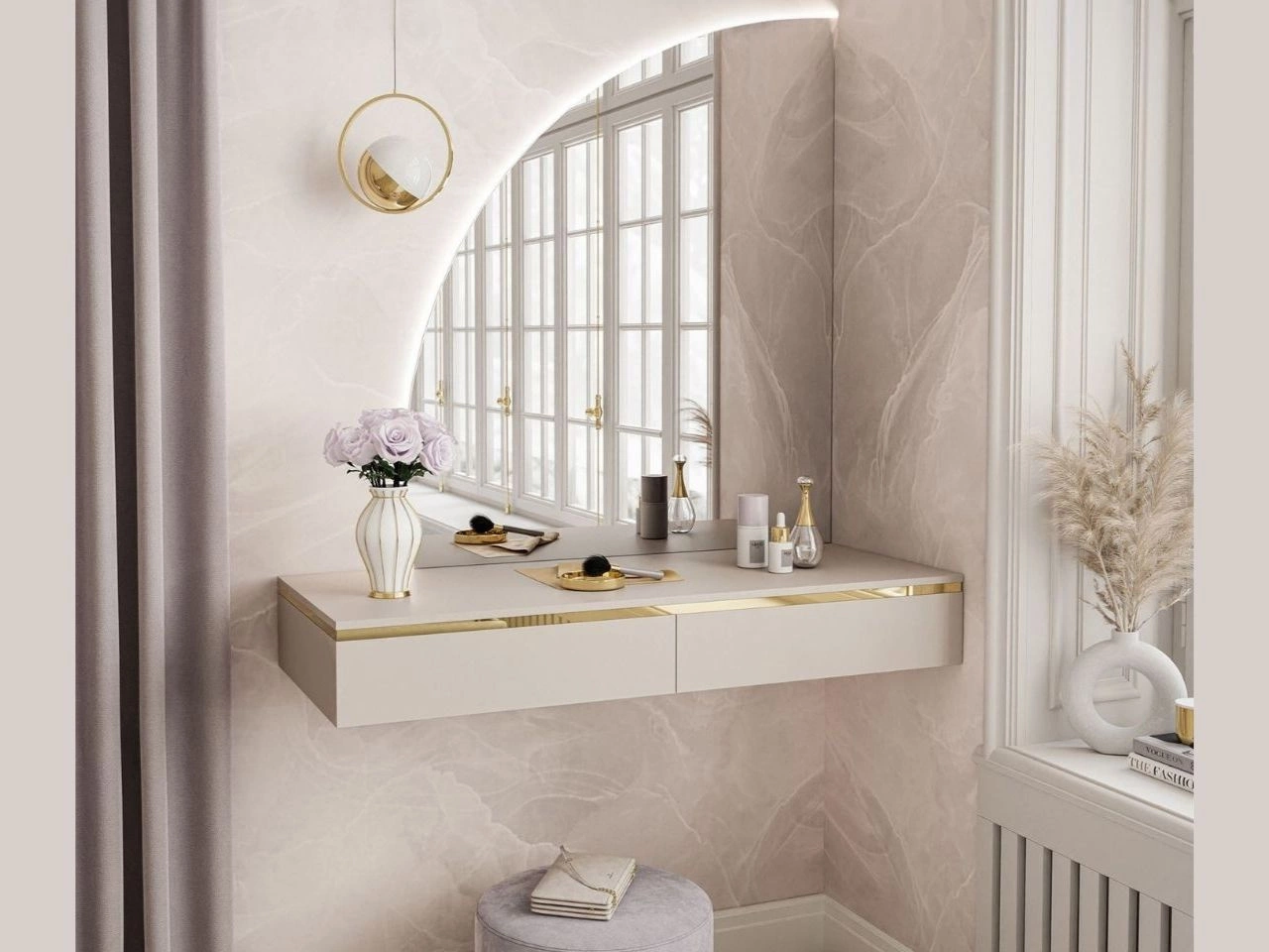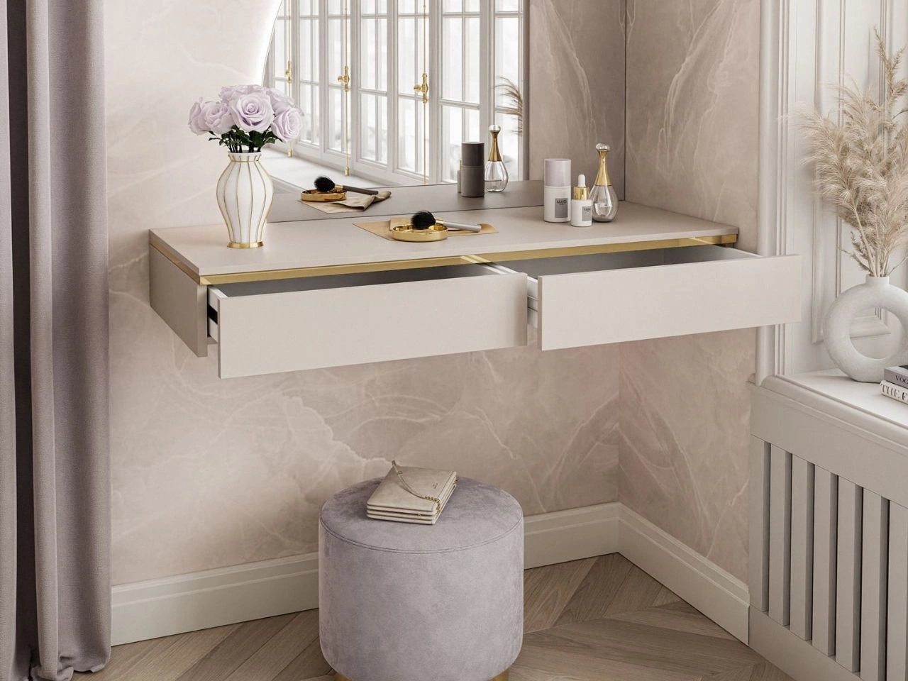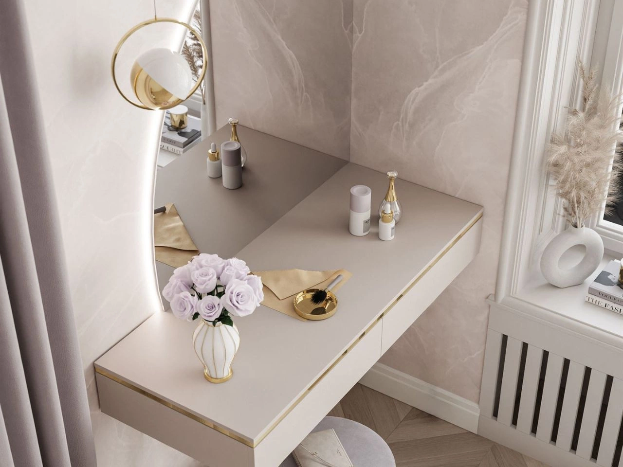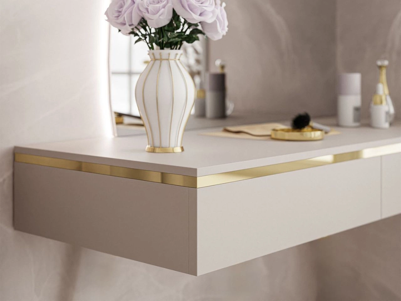 Toaletka Evare to elegancki i funkcjonalny mebel, który doskonale wpisuje się w potrzeby nowoczesnych wnętrz. Jej smukła forma w wybarwieniu kaszmiru prezentuje się subtelnie i stylowo, a dekoracyjny złoty pasek wokół blatu nadaje całości luksusowego charakteru. Dzięki uniwersalnemu designowi model ten świetnie odnajdzie się zarówno w aranżacjach klasycznych, jak i minimalistycznych, dodając im nuty wyrafinowania. Jako mebel wiszący, idealnie komponuje się w przestrzeniach, gdzie liczy się lekkość i nowoczesny charakter wystroju.