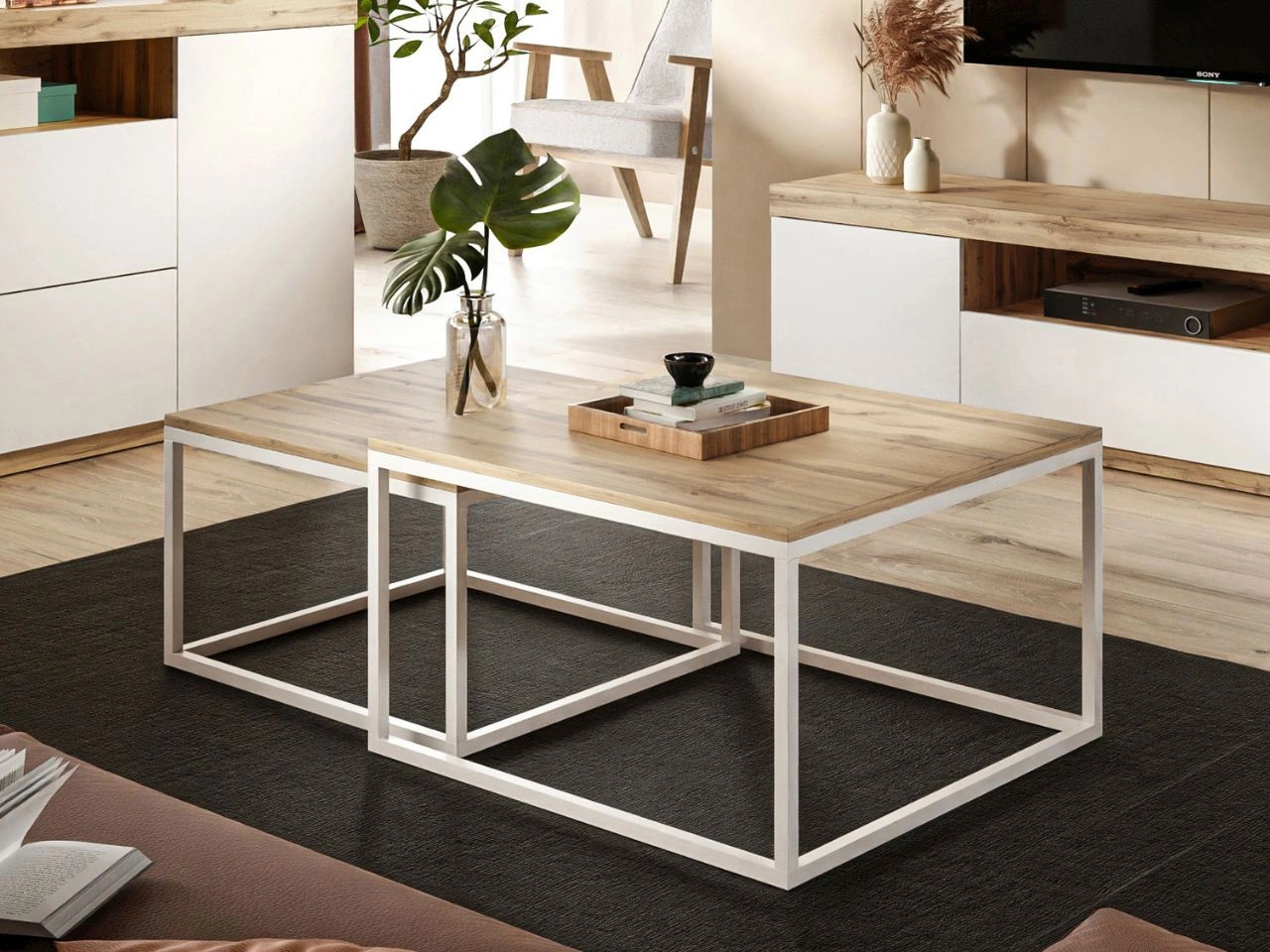 Jeśli chodzi o stoliki kawowe, to jest to zespół dwóch wariantów: mniejszego i większego. Oba posiadają blaty z płyty laminowanej w wybarwieniu dąb wotan i ustawione są na pomalowanym na biało metalowym stelażu.