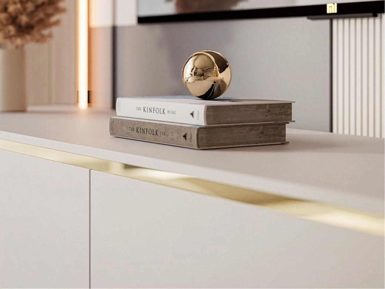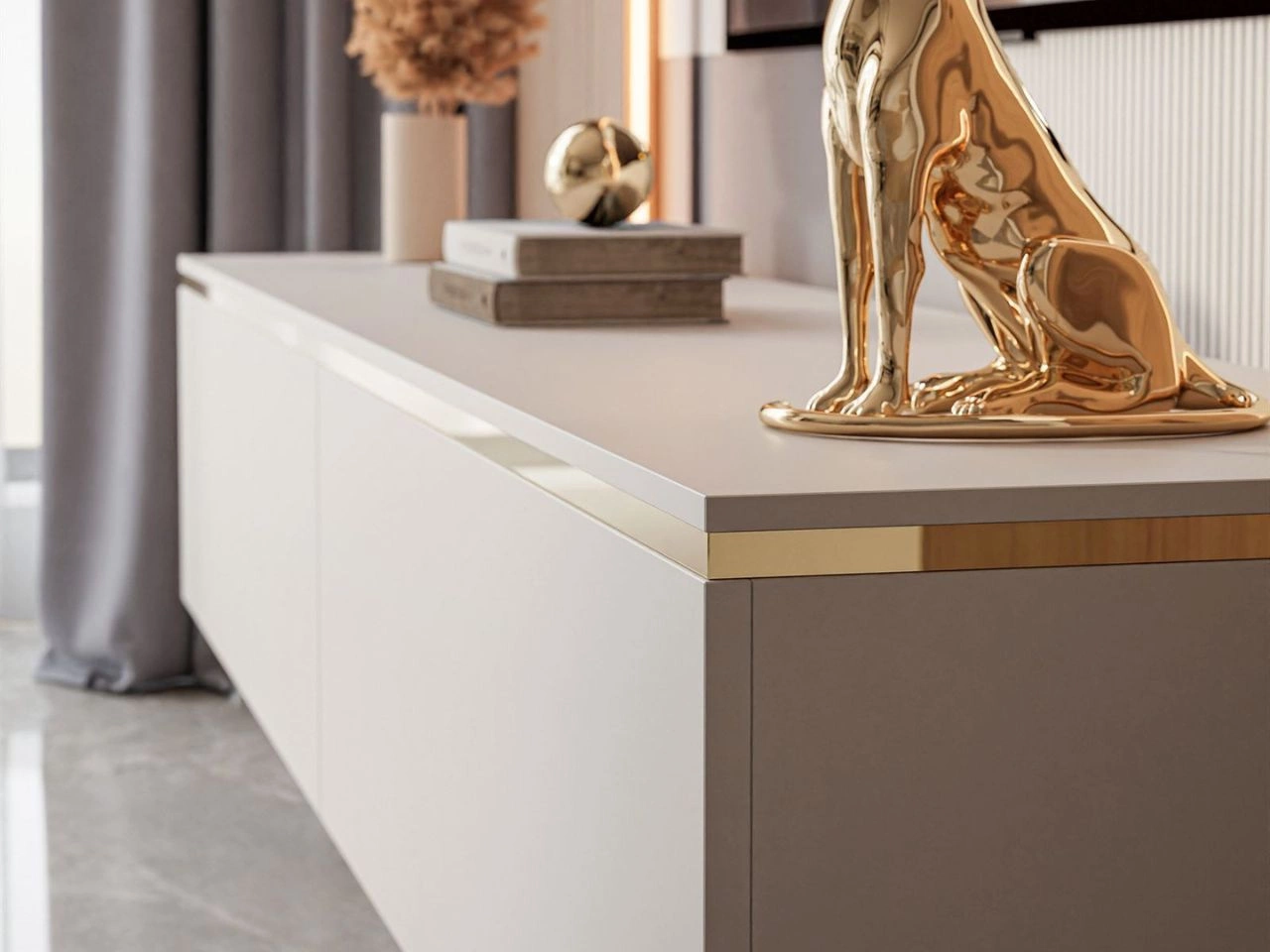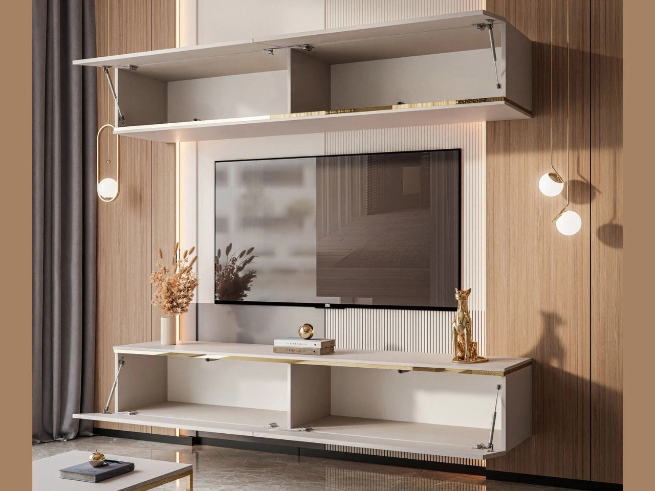 Fronty w modnym wybarwieniu kaszmiru prezentują się subtelnie i elegancko, a dekoracyjny złoty pasek podkreśla ekskluzywny styl całego zestawu. Meblościanka obejmuje pojemne szafki górne i dolne, które zapewniają odpowiednią ilość miejsca na przechowywanie akcesoriów, dokumentów czy sprzętu multimedialnego. Dzięki temu łatwo utrzymasz porządek, a jednocześnie wyeksponujesz dekoracje i elementy wystroju.