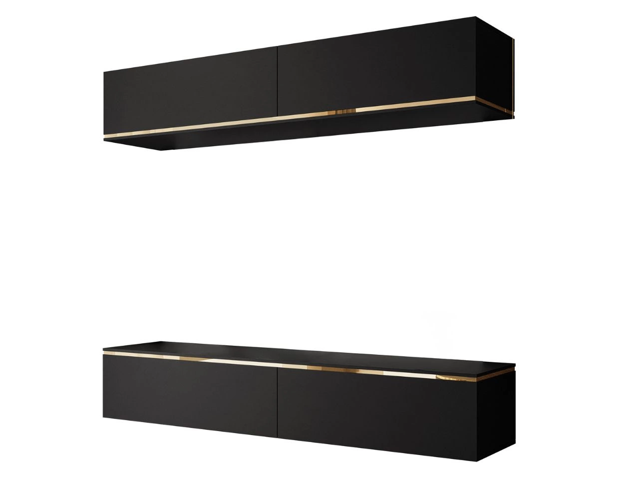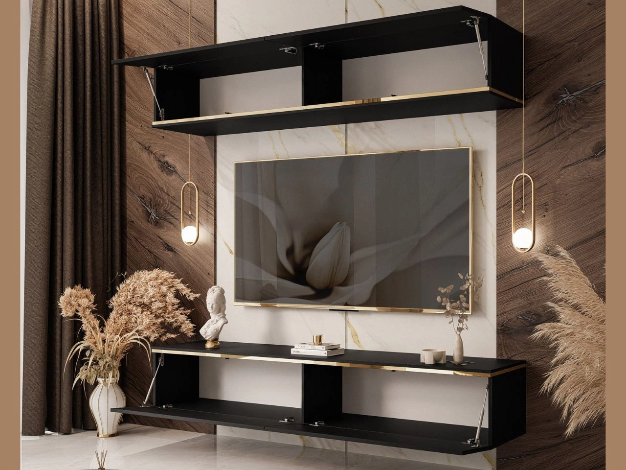 Fronty w modnym wybarwieniu czerni prezentują się subtelnie i elegancko, a dekoracyjny złoty pasek podkreśla ekskluzywny styl całego zestawu. Meblościanka obejmuje pojemne szafki górne i dolne, które zapewniają odpowiednią ilość miejsca na przechowywanie akcesoriów, dokumentów czy sprzętu multimedialnego. Dzięki temu łatwo utrzymasz porządek, a jednocześnie wyeksponujesz dekoracje i elementy wystroju.