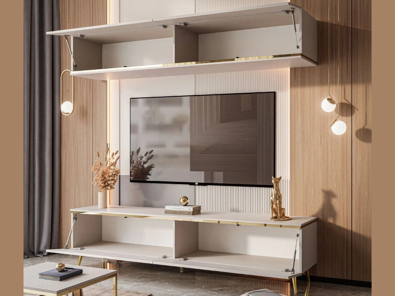 Fronty w modnym wybarwieniu kaszmiru prezentują się subtelnie i elegancko, a dekoracyjny złoty pasek podkreśla ekskluzywny styl całego zestawu. Meblościanka obejmuje pojemne szafki górne i dolne, które zapewniają odpowiednią ilość miejsca na przechowywanie akcesoriów, dokumentów czy sprzętu multimedialnego. Dzięki temu łatwo utrzymasz porządek, a jednocześnie wyeksponujesz dekoracje i elementy wystroju.