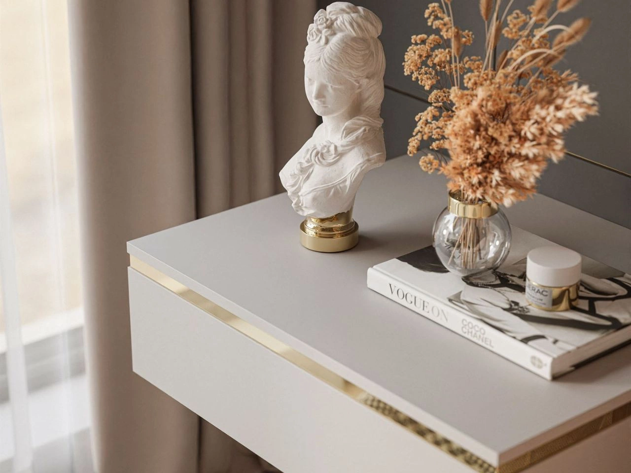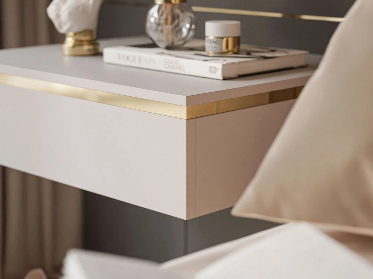 Stolik nocny Evare to nowoczesny mebel, który wprowadzi do Twojej sypialni elegancję i luksusowy charakter. Modne wybarwienie w kolorze kaszmiru świetnie komponuje się z aranżacjami zarówno klasycznymi, jak i nowoczesnymi, a subtelny złoty pasek na froncie podkreśla wyjątkowy styl kolekcji. Dzięki temu stolik staje się nie tylko praktycznym, ale również dekoracyjnym elementem wnętrza.