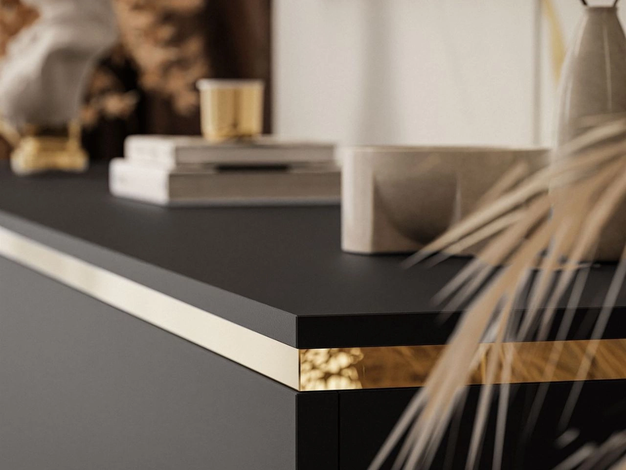 Szafka RTV Evare w kolorze czarny mat to nowoczesny mebel, który łączy funkcjonalność z luksusowym designem. Matowe wykończenie w głębokiej czerni przełamano złotymi akcentami – prostymi, metalowymi nogami i dekoracyjnym obrzeżem, które wprowadzają do wnętrza nutę elegancji w stylu glamour. Mebel wykonano z wysokiej jakości płyty laminowanej, odpornej na codzienne użytkowanie, a krawędzie wzmocniono obrzeżem ABS, chroniącym przed zarysowaniami i uszkodzeniami. Fronty otwierane są jednym dotknięciem dzięki systemowi push-to-open, a siłowniki dbają o płynne działanie klapy. Całość uzupełnia oświetlenie LED w chłodnej bieli, które efektownie podkreśla linię szafki i tworzy wyjątkowy klimat w salonie.