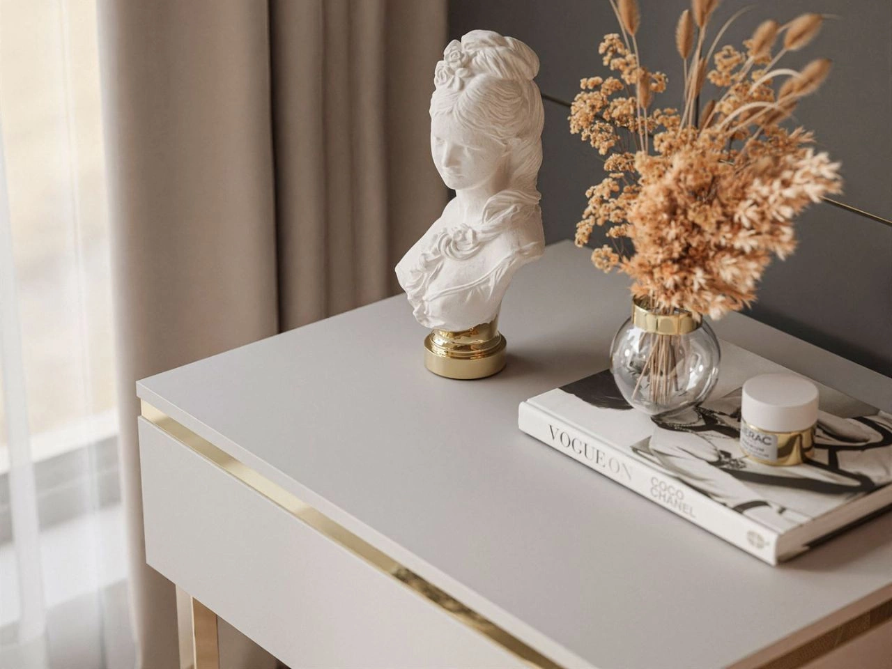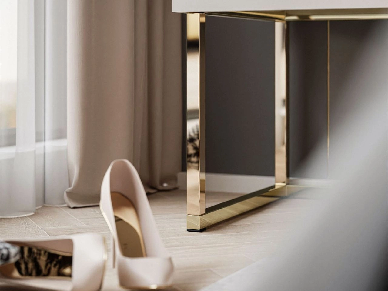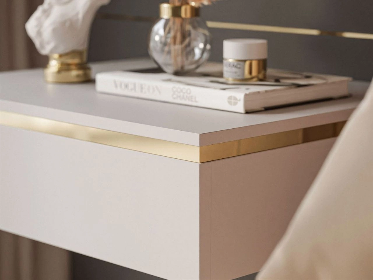 Stolik nocny Evare to nowoczesny mebel, który wprowadzi do Twojej sypialni elegancję i luksusowy charakter. Modne wybarwienie w kolorze kaszmiru świetnie komponuje się z aranżacjami zarówno klasycznymi, jak i nowoczesnymi, a subtelny złoty pasek na froncie podkreśla wyjątkowy styl kolekcji. Całość osadzona została na efektownym złotym stelażu, który dodaje meblowi lekkości i podkreśla jego luksusowy charakter.
