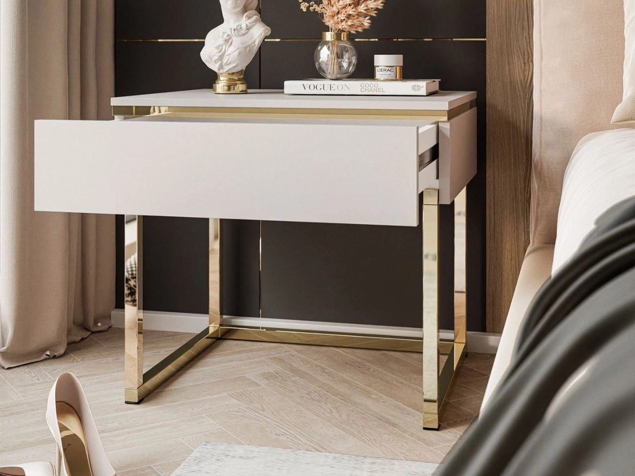Stolik nocny glamour z szufladą na złotym stelażu Evare Kaszmir