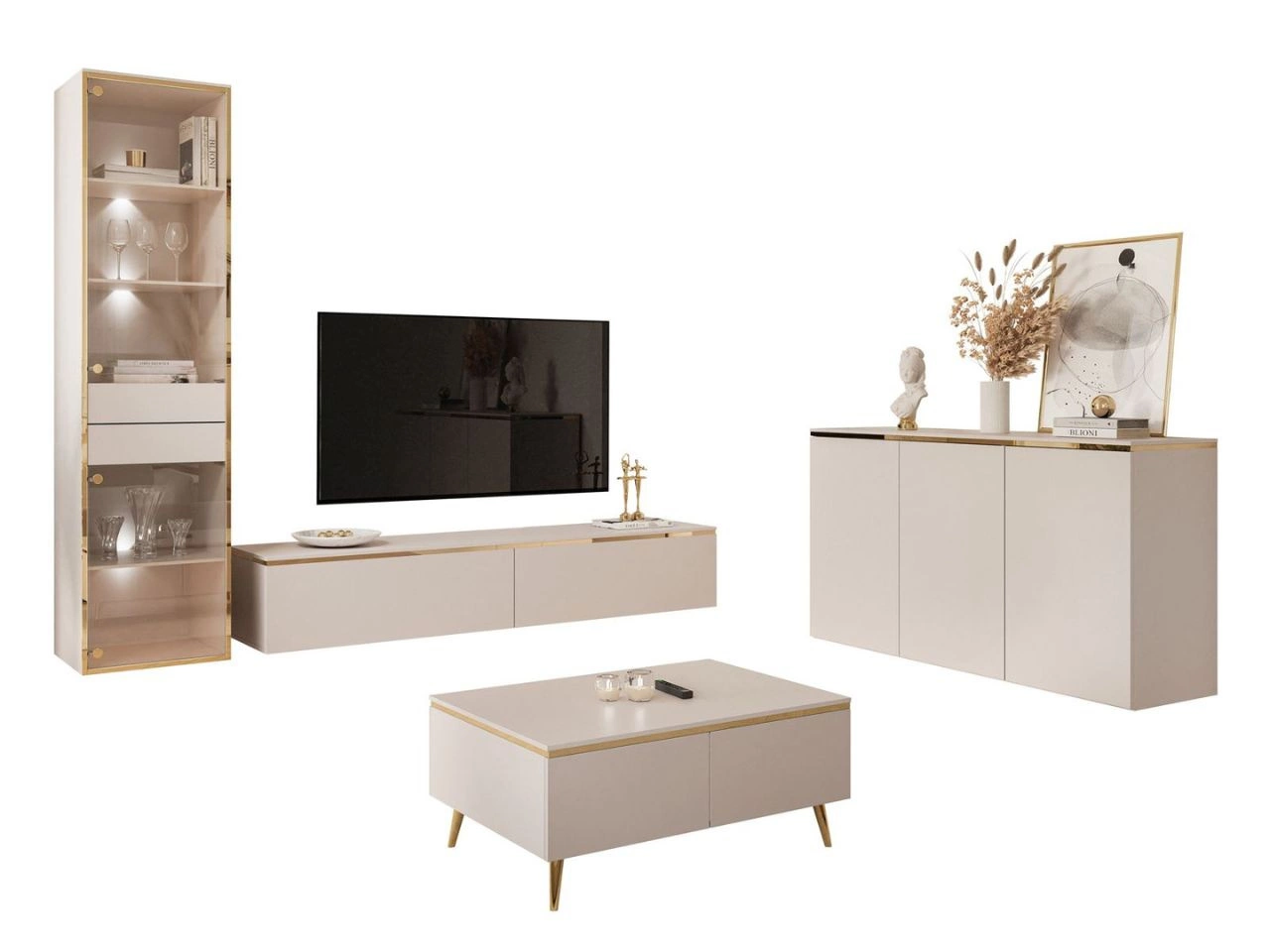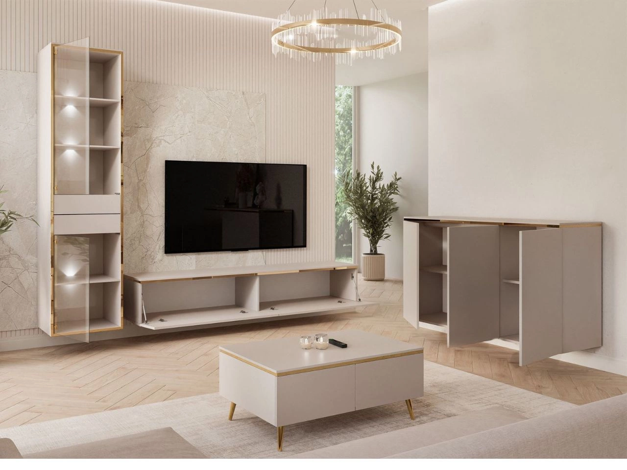 Zestaw mebli Evare to elegancka propozycja, łącząca minimalizm z luksusem i wprowadzająca do wnętrza harmonię oraz wyrafinowany styl. Kaszmirowe wybarwienie uzupełnione subtelnymi złotymi akcentami nadaje całości ponadczasowej klasy, a efektowne oświetlenie LED w chłodnym odcieniu podkreśla wyjątkowy charakter. W skład kompletu wchodzi witryna, szafka RTV, komoda oraz stolik kawowy – każdy z elementów łączy funkcjonalność z estetyką, oferując zarówno praktyczne przechowywanie, jak i efektowną ekspozycję dekoracji.