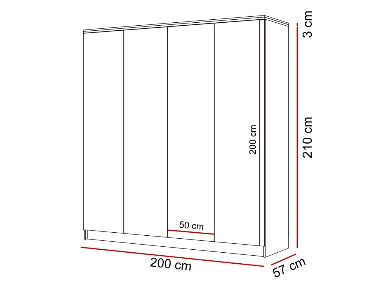 Ta czterodrzwiowa szafa oferuje przestrzeń niezbędną do przechowywania ubrań, dodatków i akcesoriów. Wewnątrz znajdują się 2 praktyczne szuflady, osadzone na kulkowych prowadnicach z pełnym wysuwem, co zapewnia wygodę użytkowania. Dziewięć przestronnych półek pozwala idealnie posegregować garderobę, a drążek na wieszaki w zestawie umożliwia komfortowe wieszanie odzieży.